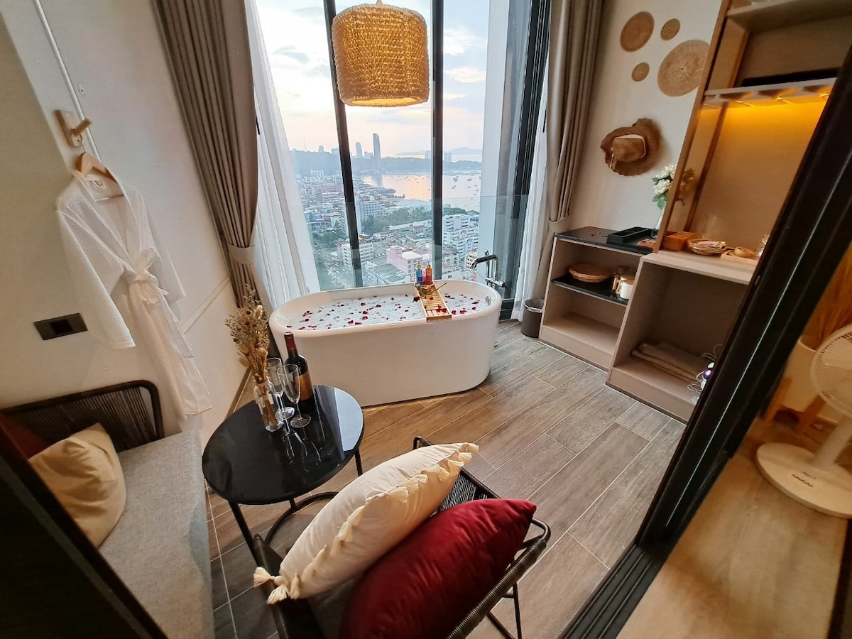 ☀️Perfet SeaView from Top 28th floor KingBed &Living Room+BathTub (Make an Insta-gram moment with BubbleBath on Sky) -Edge Central Pattaya's famous infinity pool is on the 31th floor -5Star/above Grade Facility(SkyLounge, SkyGym, SkyGarden, Dry/SteamSauna, HotJacuzzi, Lobby, etc.) -Best Location in Pattaya center -Beautiful interior with higher cost -Professional cleaning