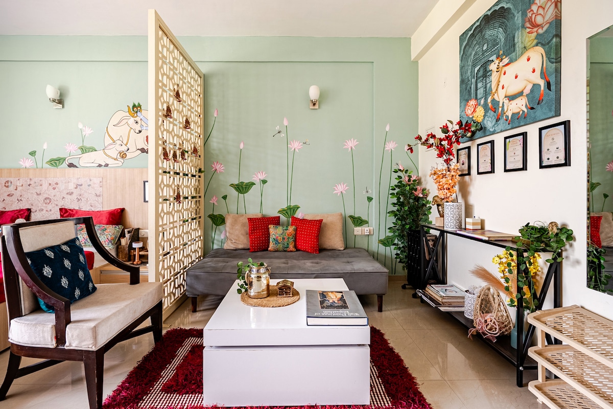 Peaceful, pretty & artsy! Less than 3 Kms (10min) from Prem Mandir, 3.5 Kms (12min) from ISKON and (15min) 4.5 Kms from Banke Bihari Step into a world of art and tranquility at our Pichwai-themed studio. This beautiful home features elegant fittings, stunning interiors, and a charming sit-out balcony perfect for relaxation. Enjoy easy access to prime temples, immersing yourself in the spiritual essence of Vrindavan. Abundance of modern amenities to ensure a comfortable and memorable stay.