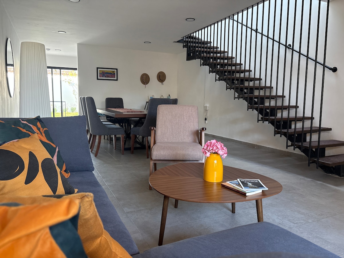 Preciosa y cómoda Casa Loft en un Residencial muy bonito, seguro y tranquilo! Muy cerca del Centro de Tequisquiapan, fácil acceso a lugares de interés de este precioso pueblito mágico! La Alberca climatizada con panel solar justo en frente de la Casa, ofrece una experiencia muy agradable. Con nosotros encontraras un lugar que exhala una paz increíble! • Diseño contemporáneo y espacios luminosos crean un ambiente acogedor para familias y amigos • Cómoda Terraza al frente con mobiliario exterior