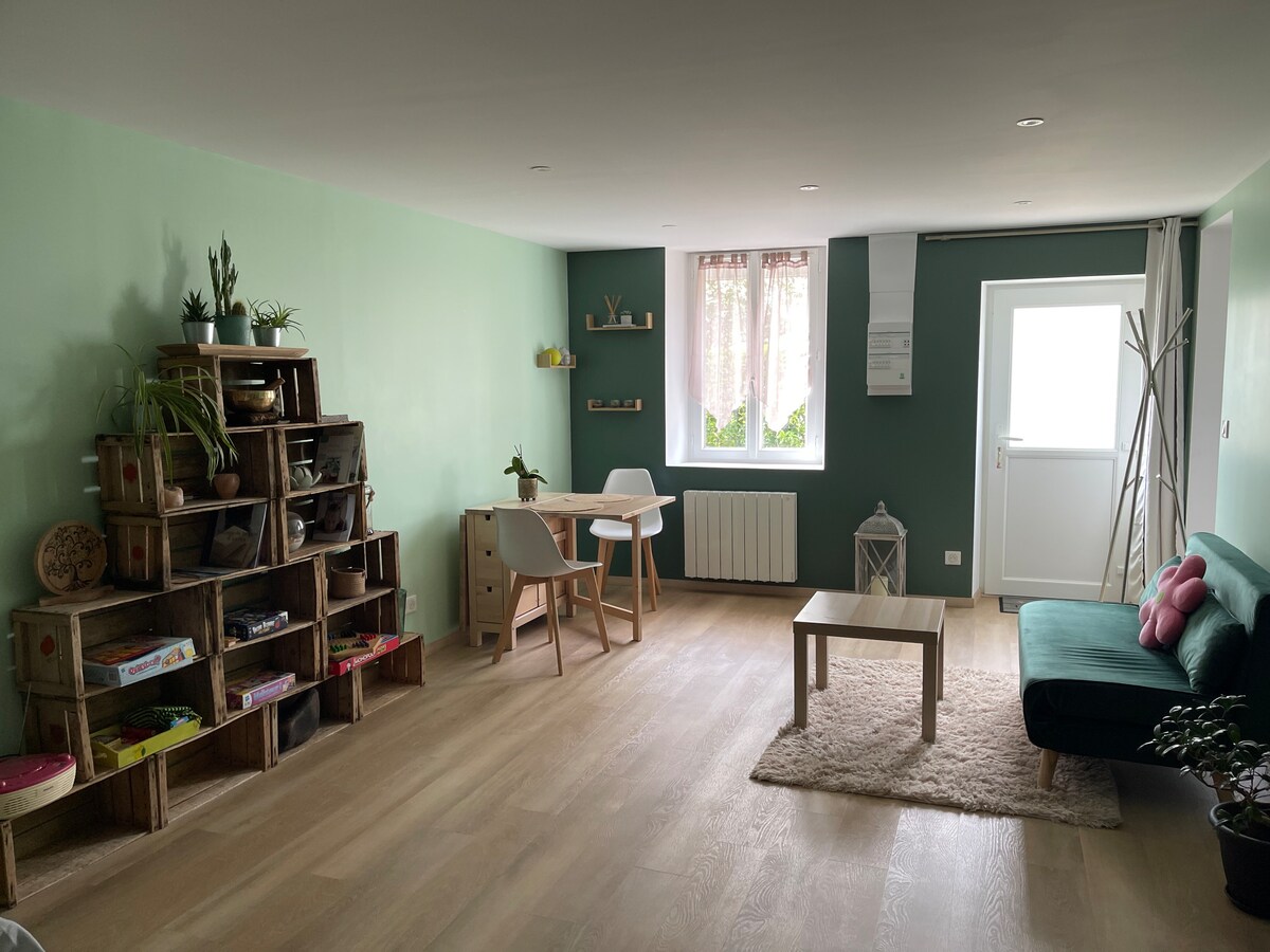Χαλαρώστε σε αυτό το ήσυχο και κομψό κατάλυμα. Ανακαινισμένο κατάλυμα που μπορεί να φιλοξενήσει ζευγάρι με παιδί + μωρό. Ξεχωριστό υπνοδωμάτιο με κρεβάτι 140 + κρεβάτι σοφίτας 90. Εξοπλισμένη κουζίνα (εστία μαγειρέματος. Απορροφητήρας. Ψυγείο. Φούρνος. Φούρνος μικροκυμάτων. Καφετιέρα με κάψουλες. Τοστιέρα. Βραστήρας. Τηλεόραση.
