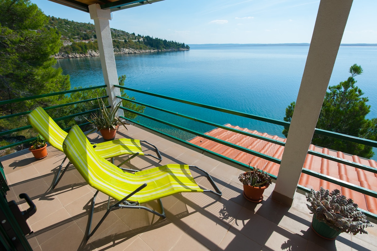 Ευρύχωρο φωτεινό οικογενειακό διαμέρισμα που βρίσκεται ακριβώς πάνω στην παραλία με μεγάλη βεράντα και όμορφη θέα στη θάλασσα. Το σπίτι περιβάλλεται από ελαιόδεντρα. Χώρος στάθμευσης δίπλα στο σπίτι. Ιδανική διαμονή για οικογένειες με μικρά παιδιά λόγω της αμμώδους παραλίας μπροστά από το σπίτι.