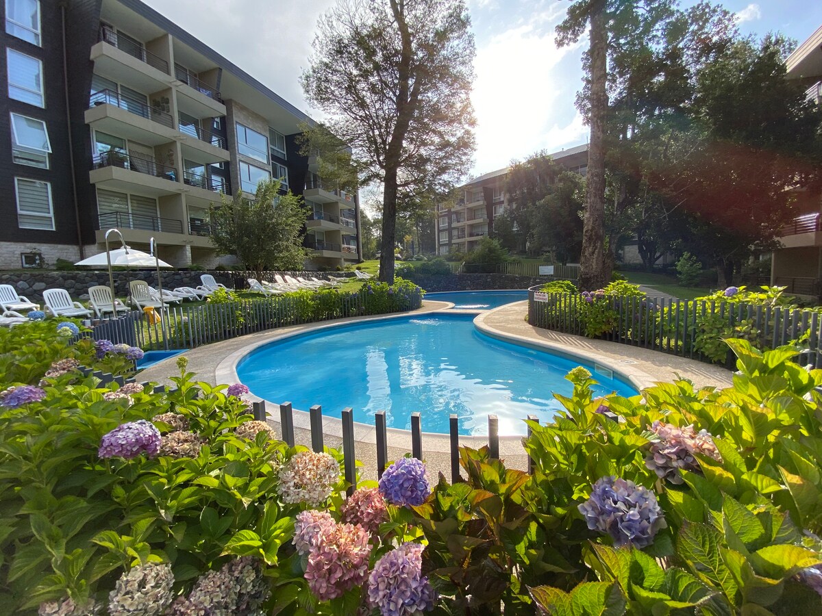Departamento frente al lago, totalmente Equipado: teléfono DDI-DDN, TV cable, refrigerador, equipo de música, cocina, vajilla completa, horno y refrigerador. Servicio de mucama (no Incluye lavado de vajilla). Cercano a centro de Ski y centros termales. A una cuadra de Casino Enjoy y a pocas cuadras de centro comercial y restaurantes. Lugar muy bonito, de naturaleza y vegetación. Ideal para relajarse, hacer trekking, turismo aventura, rafting y otros. Para niños sala de juegos y mini club.