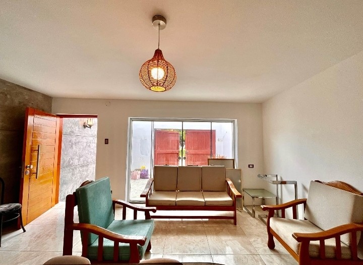 Comfortable 5-bedroom duplex with bathroom and hot water. Capacity for up to +12 people, just 1 block from the main boardwalk and steps from Playa Blanca. Cable TV, free WiFi, equipped kitchen and large terrace with grill, ideal for meetings and relaxation. Price for entire accommodation, same group or family. Does NOT include bed linen (sheets, blankets, towels), but pillows. Bed linen service available for S/. 40 per person, by prior arrangement, charged upon arrival. Guarantee S/. 750