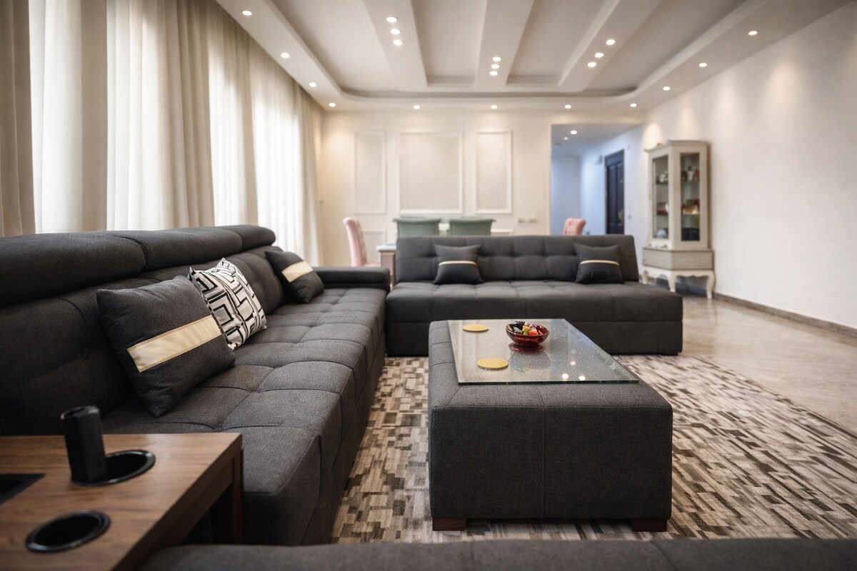 Περιγραφή του διαμερίσματος: 🛋️ Σαλόνι Πολυτελής εμπειρία ξενοδοχείου με πολυτελή πινελιά σπιτιού! Απολαύστε μια εκλεπτυσμένη ατμόσφαιρα που συνδυάζει πολυτέλεια και άνεση, όπου το σαλόνι διαθέτει κομψό μοντέρνο σχεδιασμό και προσεκτικά ευρύχωρο χώρο. Διαθέτει άνετο καθιστικό ιδανικό για χαλάρωση και PS4 για διασκέδαση. Για τους λάτρεις της προβολής, θα απολαύσετε μια πολυτελή κινηματογραφική τηλεόραση OLED 75 ιντσών με εκπληκτική ποιότητα εικόνας, μαζί με ίντερνετ υψηλής ταχύτητας για μια ολοκληρωμένη εμπειρία ψυχαγωγίας κατάλληλη για σύντομες και μακροχρόνιες διαμονές 🍸 Κουζίνα: Ανοιχτό στο σαλόνι σε ένα κομψό στιλ, με πολυτελείς καρέκλες μπαρ που προσθέτουν μια εκλεπτυσμένη αισθητική.
