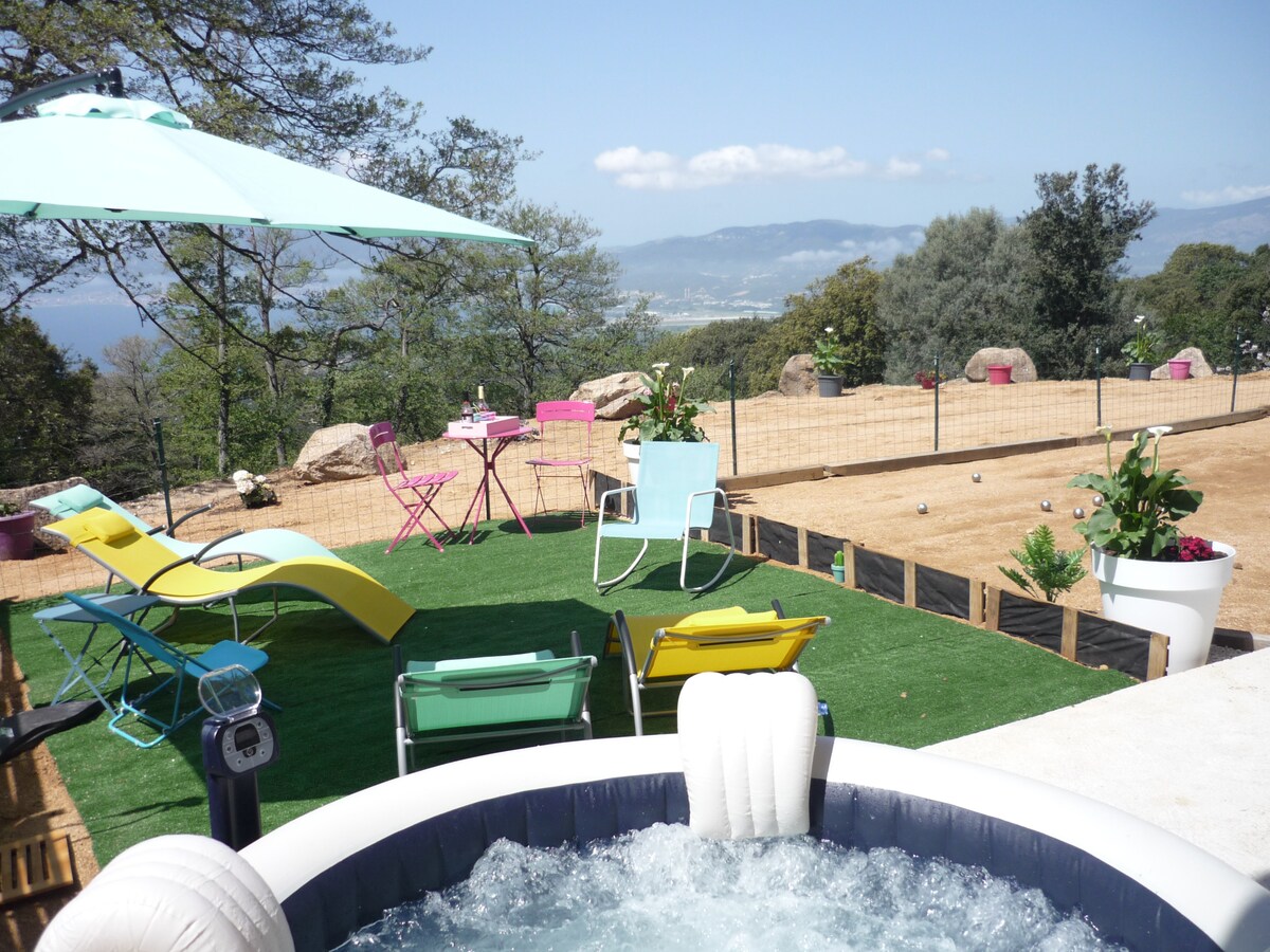 Το σπίτι μας βρίσκεται 15 χιλιόμετρα από το Ajaccio, ανάμεσα στη θάλασσα και το βουνό. Αυτό το ανεξάρτητο εξοχικό σπίτι βρίσκεται στην κορυφή ενός λόφου και προσφέρει θέα στη θάλασσα και στις κορυφές της κεντρικής οροσειράς της Κορσικής, μέσα σε ένα φυσικό περιβάλλον με χαμηλή βλάστηση. Η κεντρική τοποθεσία επιτρέπει επίσης δραστηριότητες όπως πεζοπορία, ψάρεμα στη θάλασσα και στο ποτάμι, canyoning, θαλάσσια σπορ. Σούπερ μάρκετ, φαρμακείο, γιατρός σε κοντινή απόσταση.
