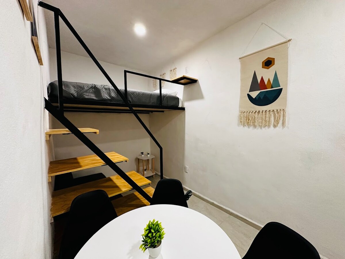 Loft moderno y completamente equipado en el corazón del Centro Histórico de Querétaro. Ideal para parejas, viajeros de trabajo o estancias medias. Cuenta con: • Tapanco con cama QS • Sofá cama matrimonial • Aire acondicionado • Cocineta equipada • Baño completo privado • Comedor para 4 personas • TV y excelente ubicación A solo unos pasos de restaurantes, cafés, museos y todo lo mejor del centro. Perfecto para disfrutar la ciudad caminando o trabajar cómodamente durante tu estancia.