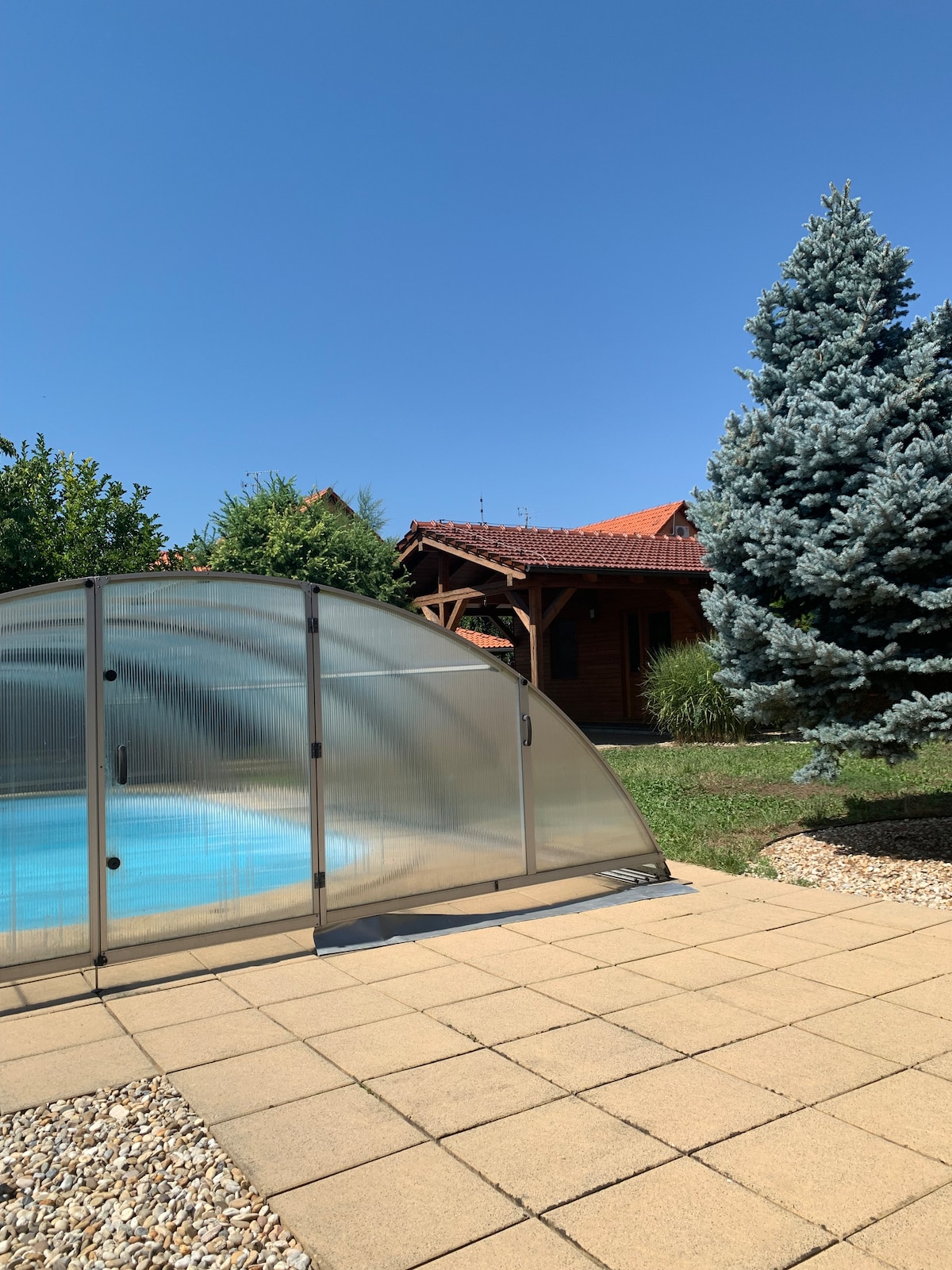 Προσφέρουμε προς ενοικίαση ένα ευρύχωρο σπίτι, το οποίο μπορεί να φιλοξενήσει άνετα 8 άτομα. Υπάρχει επίσης βρεφική κούνια και στρώμα. Οι επισκέπτες έχουν ολόκληρο το σπίτι στη διάθεσή τους. Στο ισόγειο υπάρχει σαλόνι με κλιματισμό, τραπεζαρία, εξοπλισμένη κουζίνα με εντοιχισμένες συσκευές, ψησταριά, καφετιέρα. Στη σοφίτα υπάρχουν τέσσερα υπνοδωμάτια, ένα από τα οποία είναι κλιματιζόμενο. Υπάρχουν δύο μπάνια. Το σπίτι έχει μερικώς υπόγειο. Η στάθμευση είναι δυνατή δίπλα στο σπίτι ή στο γκαράζ. Στον κήπο υπάρχει μια κλειστή πισίνα και μια σκεπαστή βεράντα με καθιστικό.