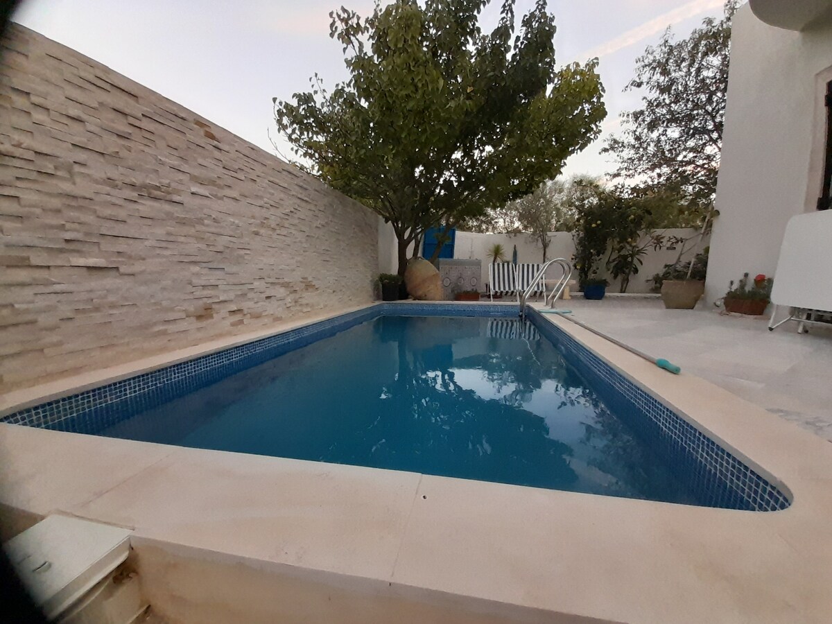 Rez de chaussée autonome : 3 terrasses, grand jardin, piscine privée, Hammam (payant). Vous adorerez le décor en bois style balinais. Un 150 m² éclairé par des grandes bais vitrées, grand salon, 2 chambres à coucher dotée chacune de sa propre salle de bain, cheminée électrique, cuisine équipée, et espace bureau. Services inclus : - Café, sucre, eau à l'arrivée - Linge, draps, shampooing Services optionnels : - Navette Aéroport - Petit-déjeuner, cuisine TN - Hammam 30 euros