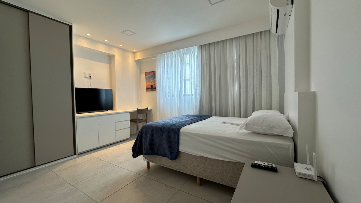 Hospede-se em Boa Viagem com conforto e praticidade, flat no 11° andar, com WC, Wi-Fi rápida, ar condicionado, tv smart 42”, cozinha com cooktop, geladeira, microondas e utensílios diversos. Nas janelas, cortinas transparentes e também black out. Há 01 vaga de garagem. Condomínio seguro e muito organizado, dispõe de marketplace, lavanderia e piscina com bela vista na cobertura. Prédio próximo ao colégio Boa Viagem, a Av. Domingos Ferreira e com rápido acesso ao shopping Recife e a Via Mangue.