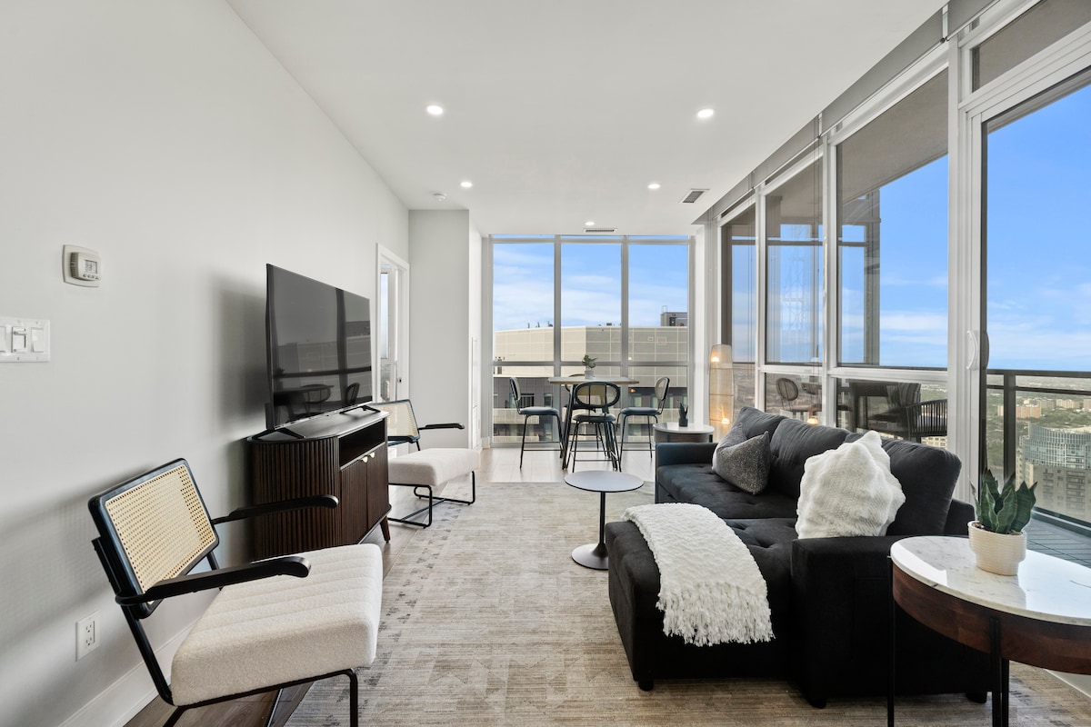 Καλωσορίσατε στο μοντέρνο και πολυτελές γωνιακό ρετιρέ μας! Αυτός ο φωτεινός χώρος, με κομψό σχεδιασμό, πλούσια βλάστηση και πολυτελείς πινελιές, προσφέρει άνεση, κομψότητα και μια χαλαρή τροπική ατμόσφαιρα. Απολαύστε την εκπληκτική πανοραμική θέα στην πόλη και χαλαρώστε με πολυτελείς παροχές, όπως εξωτερική πισίνα, υδρομασάζ και σάουνα με ατμό. Σε απόσταση 15 λεπτών με το αυτοκίνητο από το κέντρο της πόλης. Δημόσια συγκοινωνία στο κατώφλι. 10 λεπτά με το αυτοκίνητο μέχρι το Rogers Stadium. Ιδανικό για απαιτητικούς επισκέπτες που αναζητούν μια αναβαθμισμένη διαμονή στον ζωντανό αστικό πυρήνα του Τορόντο