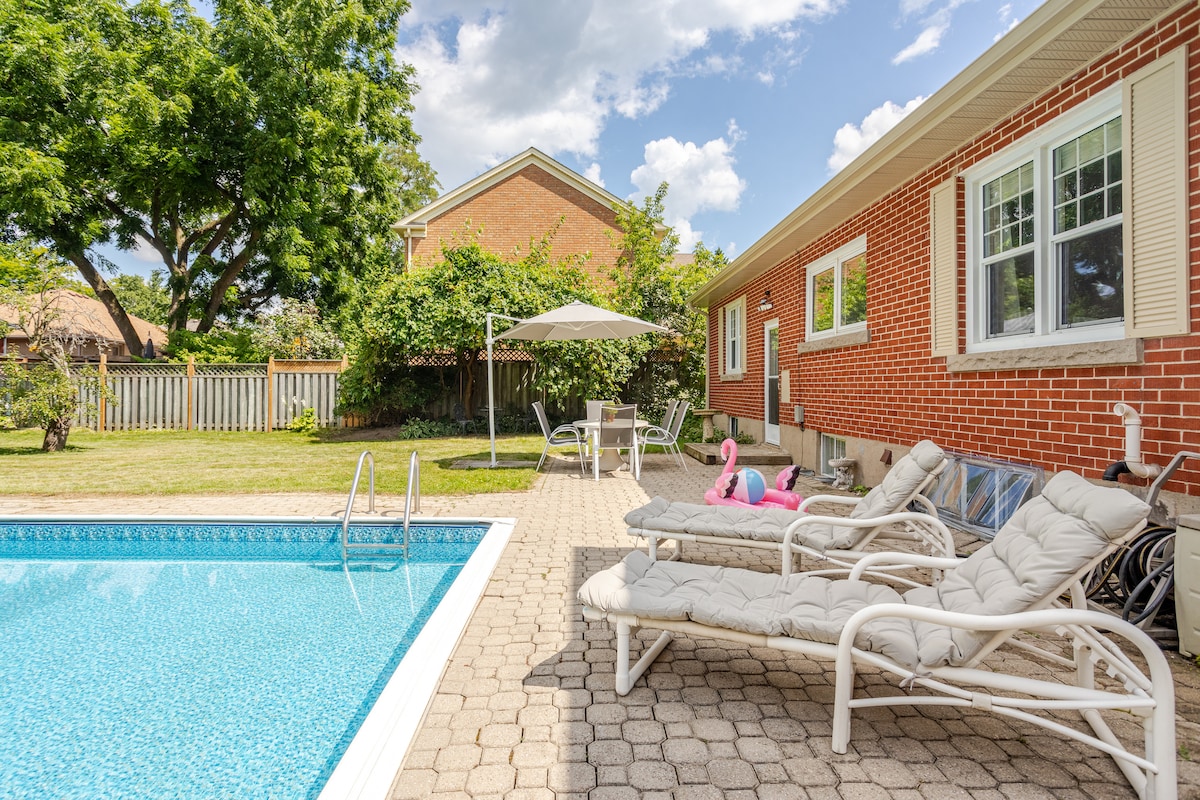 Το ιδανικό σπίτι για την οικογένεια ή τους συναδέλφους σας! Υπάρχει χώρος για όλους με 2 σαλόνια, 3 τηλεοράσεις, μεγάλο ψυγείο, πλυντήριο πιάτων, μεγάλη αυλή και πισίνα! Σε κεντρική τοποθεσία στο κέντρο του Μπέρλινγκτον με εύκολη πρόσβαση στον σταθμό QEW, 403 & 407 και Go. Κοντινή απόσταση από το παραθαλάσσιο πάρκο Spencer Smith, το εμπορικό κέντρο Mapleview και τα νοσοκομεία. Το ίντερνετ υψηλής ταχύτητας και ο ειδικός χώρος εργασίας διευκολύνουν την εργασία από το σπίτι, ενώ τα παιδιά παίζουν στην πισίνα! Το σπίτι είναι πλήρως εξοπλισμένο - απλά φέρτε τα ρούχα σας!