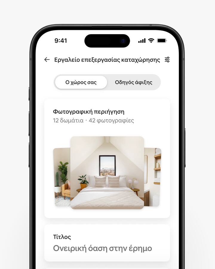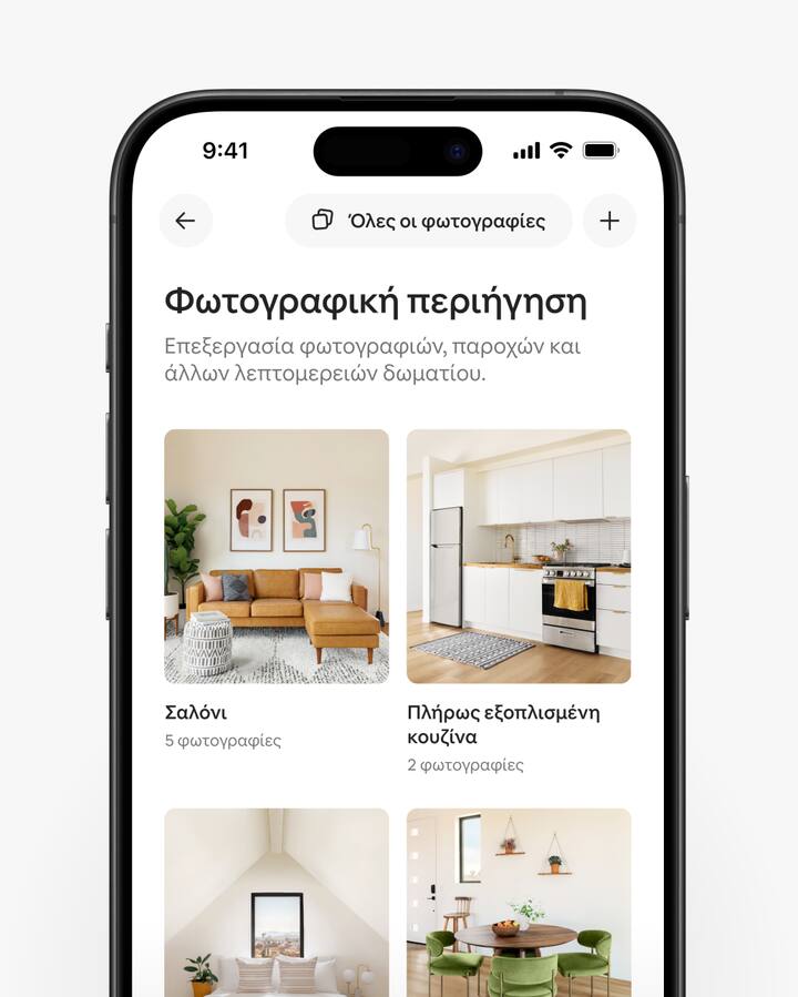Οργανώστε τις φωτογραφίες σας ανά δωμάτιο στη στιγμή, με τη βοήθεια της τεχνητής νοημοσύνης. Μπορείτε να κάνετε αλλαγές και να προσθέσετε παροχές για να δώσετε στους επισκέπτες μια ολοκληρωμένη εικόνα.