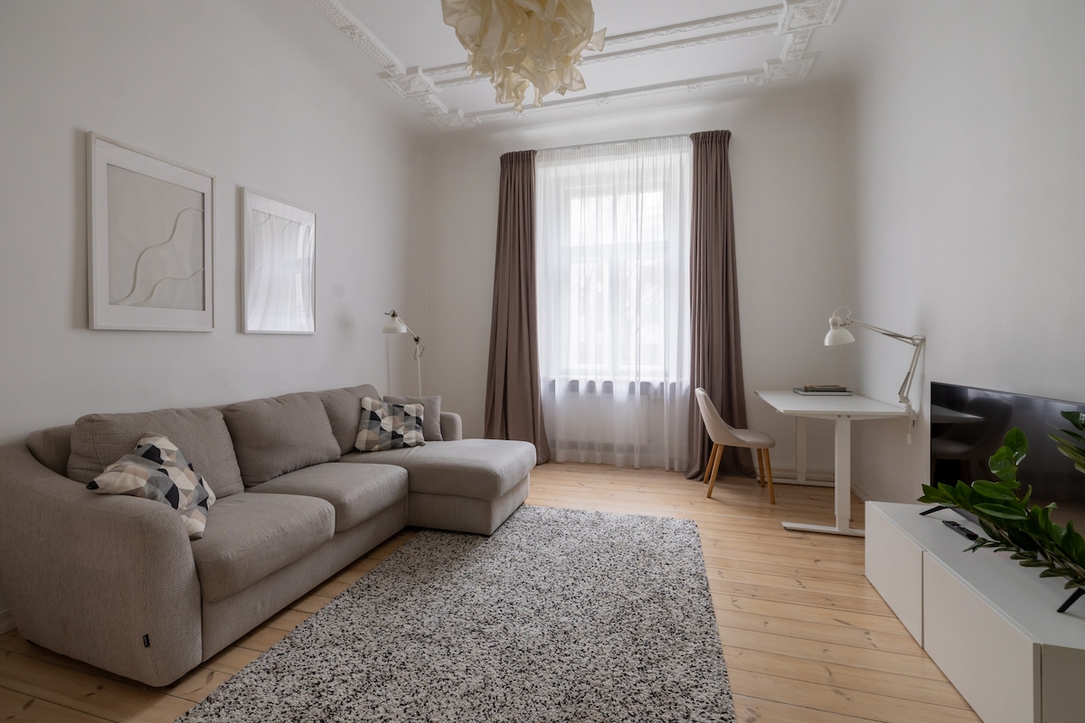 Ευρύχωρο διαμέρισμα στο κέντρο της Ρίγας σε ανακαινισμένο σπίτι του 19ου αιώνα, σε κοντινή απόσταση από κορυφαία αξιοθέατα, μουσεία, πάρκα, εστιατόρια και μπαρ. Βρίσκεται σε έναν ήσυχο δρόμο και προσφέρει ηρεμία μετά από μια κουραστική ημέρα εξερεύνησης της πόλης. Παλιά πόλη 650 μ., Κεντρικός σταθμός 400 μ., Πάρκο Βέρμαν 140 μ., Αεροδρόμιο 20 λεπτά. Οι εκπτώσεις ισχύουν αυτόματα για κρατήσεις άνω της μίας εβδομάδας και του ενός μήνα.