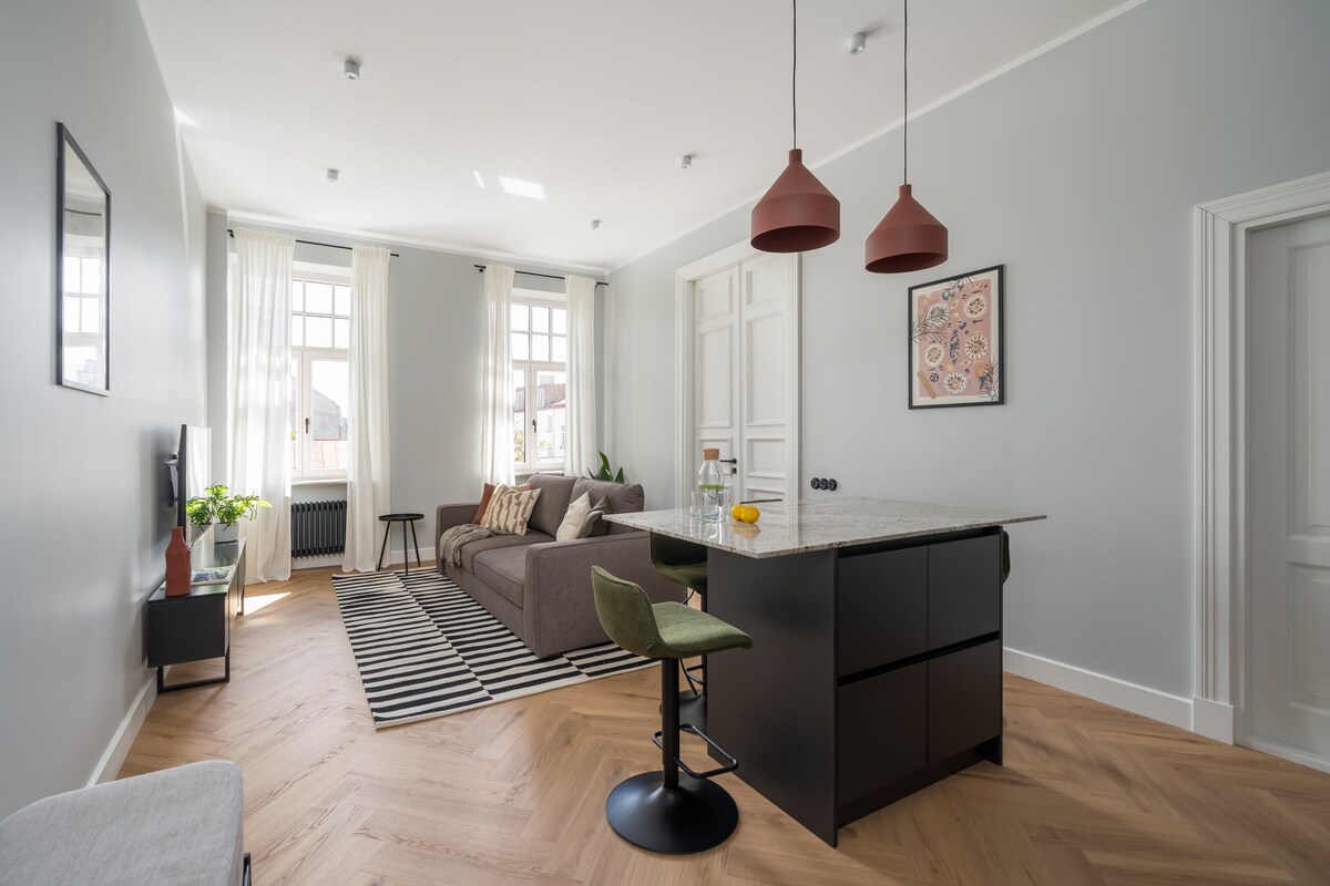Newly renovated apartment in Riga best location- just steps away from St. Peter's Church, on one of the most charming and most photographed streets of Riga- Jāņa street. The apartment has amazing view to St. John's Church, as well holds true Old Town charm-with historical windows and doors with brass handles as well as renovated hard wood floors. At the same time having everything needed for a great stay- equipped kitchen, fast Wifi, TV, Netflix, comfy beds, modern bathroom and even a bathtub!