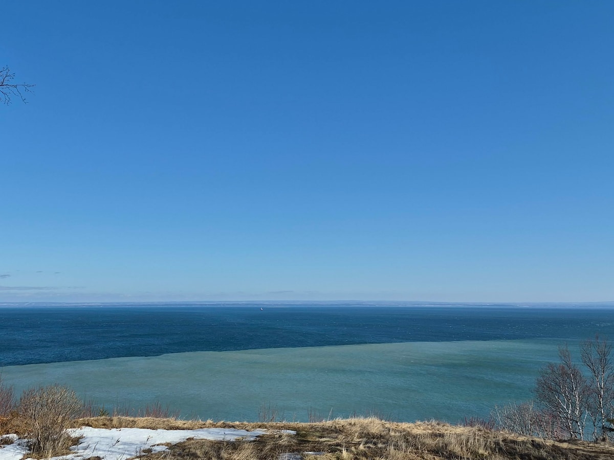 Petite maison en bord de mer chaleureuse. Les boiseries qui recouvrent son intérieur ne sont pas sans rappeler la nature qui l'entoure. Nichée à un lancer de roche du fleuve Saint-Laurent, il va sans dire que les couchers du soleil y sont exceptionnels. Bien que son confort vous rappellera la maison, la vue imprenable saura vous dépayser.
