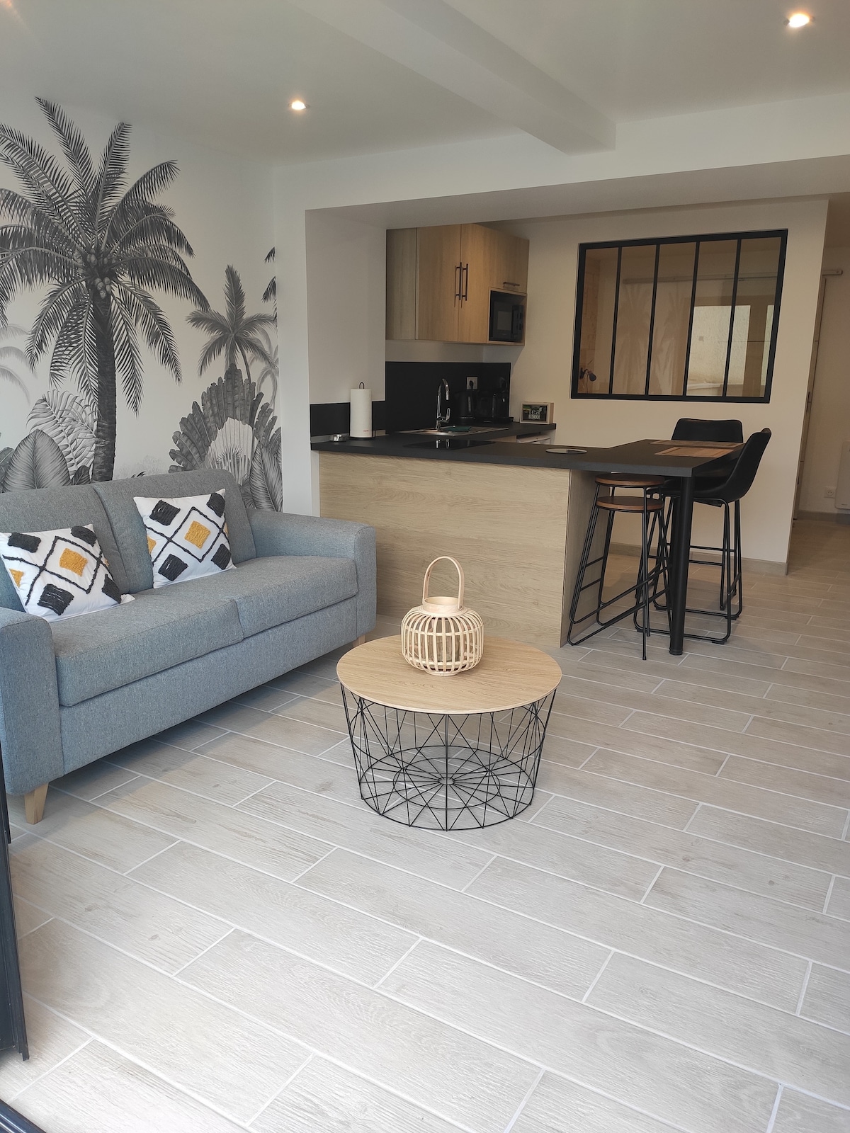 Appartement indépendant de 35 m² très fonctionnel avec vue sur le jardin, au rdc d'une villa située au milieu d'un terrain arboré, habitée à l'étage par son propriétaire. Stationnement dans la cour sécurisée par un portail électrique. Quartier très tranquille. Supermarché à 2 mn à pied. A 5 mn en voiture du Scarabée. Vous disposerez d'une grande terrasse avec une table et des chaises vous permettant de prendre vos repas dehors et d'un accès à la pelouse située devant la maison.