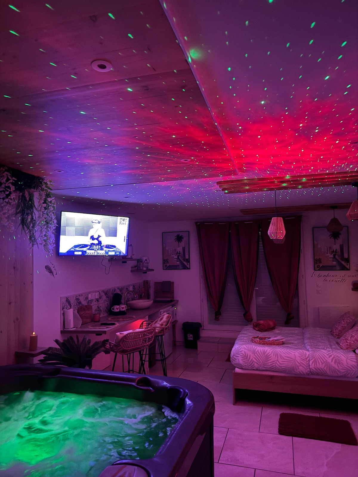 Ανακαλύψτε την απόλυτη άνεση στο διαμέρισμά μας 80 τ.μ., που βρίσκεται μεταξύ του Λούβρου της Λενς και του σταδίου της Λενς. Απολαύστε ένα τζακούζι 2 θέσεων με 95 πίδακες, μια τηλεόραση OLED 4K 165cm. Εξοπλισμένη κουζίνα. Το μπάνιο διαθέτει ιταλικό ντους, αιωρούμενη τουαλέτα, αντιανεμικό καθρέφτη LED και στεγνωτήρα πετσετών. Το υπνοδωμάτιο διαθέτει ένα μεγάλο κρεβάτι 180x200cm, ένα κρεμαστό δίχτυ 10m2 με καμβά 260cm, έναν καναπέ, ένα τραπεζάκι και μια μηχανή Nespresso, έναν βιντεοπροβολέα UHD 4K HDR