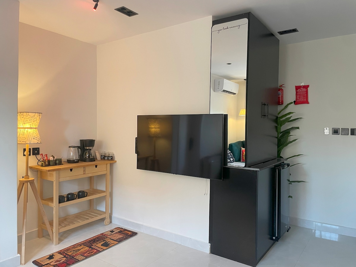 Μοντέρνο διαμέρισμα 1 υπνοδωματίου στο Hittin, μια από τις καλύτερες τοποθεσίες του Ριάντ, λίγα λεπτά από το Boulevard City και κορυφαία καφέ. Σχεδιασμένο για άνεση και ευκολία, με self check-in και πλήρες έξυπνο σύστημα. Διαθέτει ένα ζεστό σαλόνι, ένα άνετο υπνοδωμάτιο, Smart TV 85” και ένα κομψό ηλεκτρικό τζάκι για μια χαλαρωτική ατμόσφαιρα. Πλήρως εξοπλισμένη κουζίνα με φούρνο, φούρνο μικροκυμάτων, ηλεκτρική κουζίνα, πλυντήριο πιάτων και πλυντήριο ρούχων. Καθαρό, κομψό και ιδανικό για ζευγάρια, επαγγελματίες ταξιδιώτες και βραχυπρόθεσμες ή μακροπρόθεσμες διαμονές.
