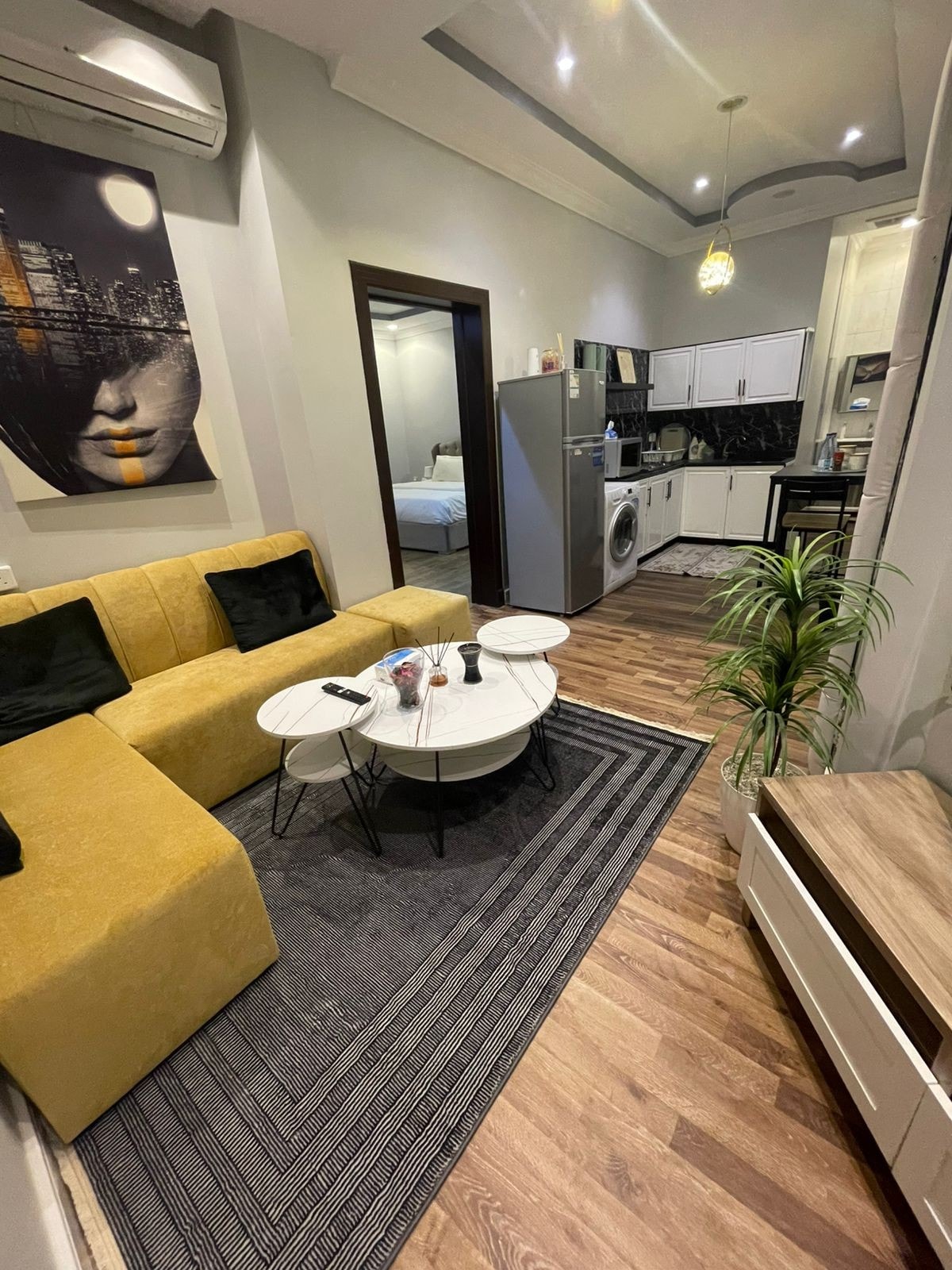 Ένα μοντέρνο και κομψό ανεξάρτητο διαμέρισμα κουζίνας και σαλονιού με έξυπνη πρόσβαση,που διαθέτει ένα άνετο στρώμα κρεβατιού, καφέ μπαρ, φώτα με ροοστάτη, αποσμητικό χώρου, έξυπνη οθόνη 60 ιντσών συνδεδεμένη με internet και μια πολύ άνετη συνεδρία σαλονιού. Περιέχει υπηρεσίες (ψυγείο, ηλεκτρικός φούρνος,βραστήρας, καφετιέρα, φούρνος μικροκυμάτων,φλιτζάνια και σκεύη) Αριθμός επισκεπτών έως 4 άτομα. Μια ξεχωριστή τοποθεσία βόρεια της γειτονιάς Riyadh Kairouan κοντά: 2 λεπτά μέσω του King Salman 4 λεπτά μέσω της οδού King Fahd 18 λεπτά μέχρι τη λεωφόρο. 20 λεπτά από το αεροδρόμιο.
