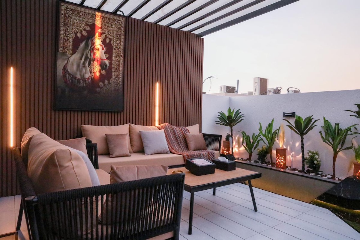 A modern apartment designed for an exceptional stay, located in one of Riyadh’s finest neighborhoods with a stunning view of KAFD. It features an outdoor seating area with a screen and projector for enjoyable evenings. For your comfort, the bed includes a high-quality 14cm extra layer. “We also offer event coordination services for special occasions (including cake and accessories) for an additional fee with prior booking, ensuring an unforgettable experience “