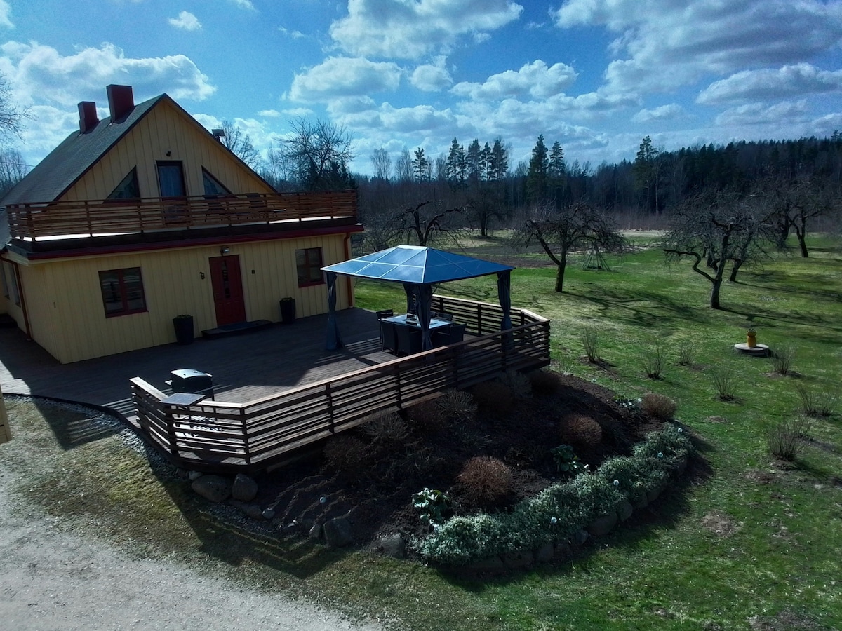 Holiday home is located by the pine tree forest, very beautiful, silent and clean place. Guest house offers big sauna and nice pond next to the house. Warm and cosy living space on the first floor. Three big bedrooms on the second floor with comfortable beds, and total capacity of 10 people. Indoor and outdoor fireplaces. Holiday home offers outdoor sport activities such as basketball, volleyball, soccer. Swings, trampoline and sandbox for children.Sauna for a fee.