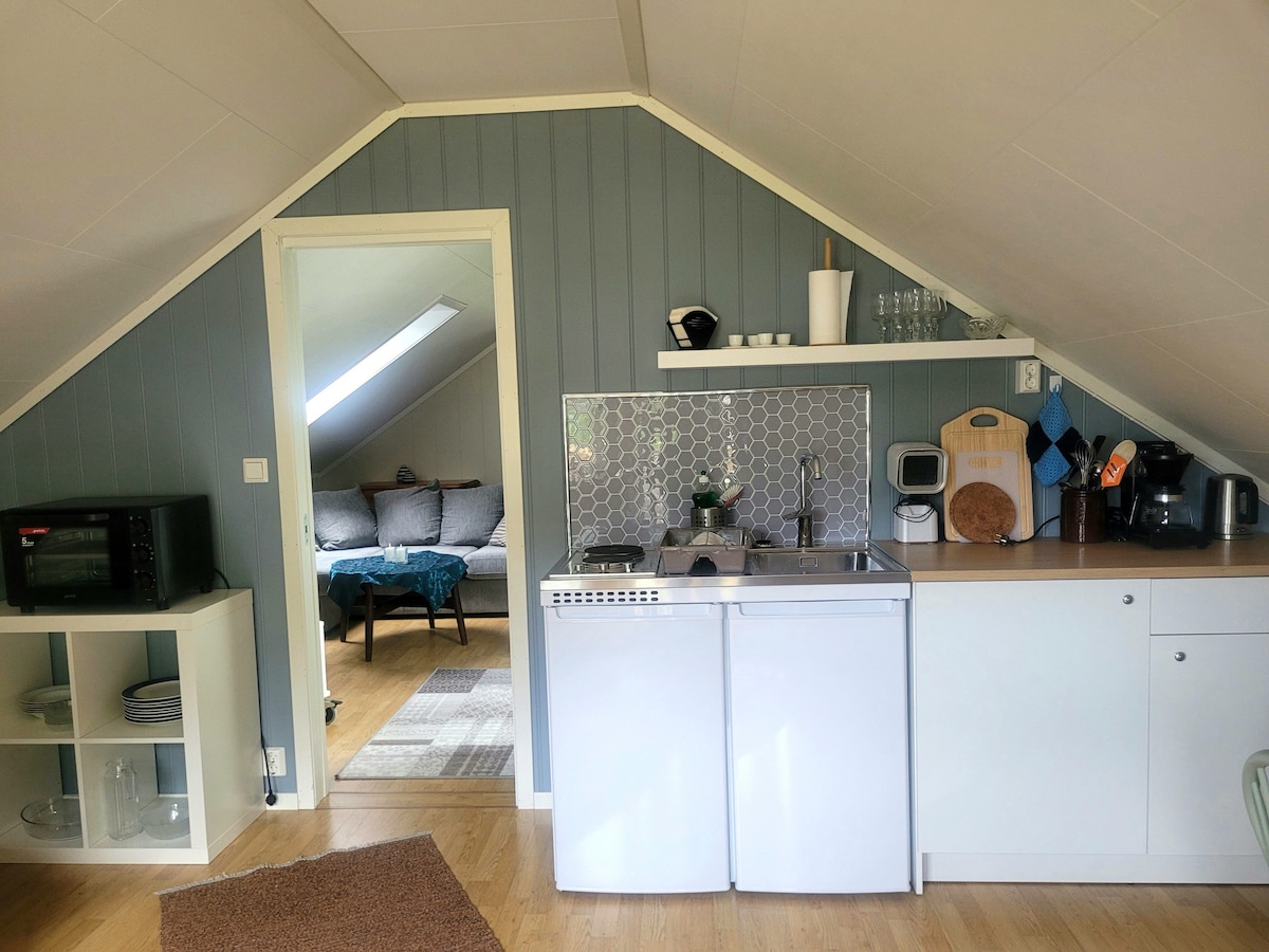 The apartment features one bedroom with a 150 cm double bed, as well as a loft space. The bedroom has a smal working desk with a 24 inch screen. The kitchen is equipped with a small dining table, and the living room includes a TV with channels and streaming apps and free Wi-Fi. Please note: the apartment is located on the 4th floor with no elevator, and reaching it from the city center requires walking up a very steep 200-meter hill. Electric car charging and parking is available.