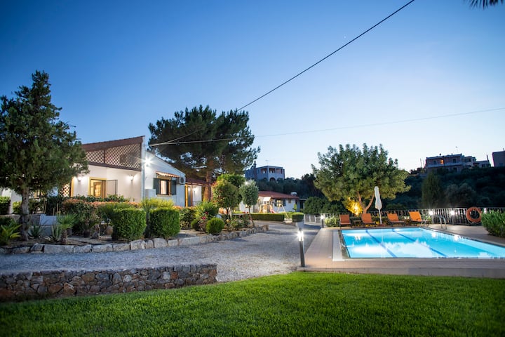 Μπαίνοντας στην πύλη της βίλας, θα βρεθείτε παραδόξως σε έναν εκπληκτικό εξωτερικό χώρο 2.500 τ.μ. με φοίνικες, πεύκα, οπωροφόρα δέντρα, γκαζόν και κάθε είδους διακοσμητικά και αρωματικά φυτά. Αυτή η όμορφη ατμόσφαιρα ολοκληρώνεται από μια εκπληκτική ιδιωτική πισίνα (9 μ. και βάθος 1,40μ.) που προσφέρει υπέροχη θέα στην καταγάλανη θάλασσα και την κρητική ύπαιθρο. Δίπλα στην πισίνα, υπάρχει ένα υπέροχο κιόσκι και ένας χώρος με γκαζόν, όπου μπορείτε να χαλαρώσετε και να κάνετε ηλιοθεραπεία απολαμβάνοντας ένα κρύο, δροσιστικό ρόφημα. Η βεράντα του σπιτιού με την τραπεζαρία για 6 άτομα είναι το ιδανικό σημείο για να απολαύσετε άφθονα γεύματα με την οικογένεια και τους φίλους σας ή να νιώσετε την αναζωογονητική νυχτερινή δροσιά ενώ απολαμβάνετε ένα καλοκαιρινό κοκτέιλ. Η βίλα διαθέτει επίσης ένα άλλο υπαίθριο καθιστικό με εγκαταστάσεις μπάρμπεκιου και ένα μεγάλο τραπέζι για 7 άτομα. Οι μικροί μας φίλοι μπορούν να απολαύσουν στιγμές χαράς και παιχνιδιού στη νέα μας παιδική χαρά. Ανάλογα με την εποχή, οι επισκέπτες μας μπορεί να έχουν την αλλαγή για να δοκιμάσουν φρέσκα φρούτα από τα δέντρα μας (βερίκοκα, αχλάδια, πορτοκάλια, πατάρι, μανταρίνια, λεμόνια κ.λπ.).