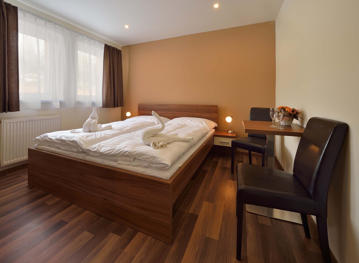 Izba v hotelovom štandarde ponúka maximálny komfort ubytovania. Je vybavená príslušným počtom postelí (jednolôžkových a dvojlôžkových), nočnými stolíkmi, lampami, vešiakmi, komodami a skriňami. K dispozícii sú aj uteráky.