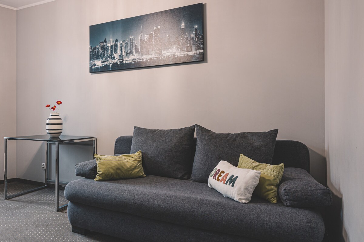 Κομψό διαμέρισμα στη Μουσική Συνοικία, στο κέντρο της πόλης. Σε άμεση γειτνίαση: Μουσική Ακαδημία, Θέατρο, πάρκα, εστιατόρια, καφετέριες. Οι επισκέπτες έχουν στη διάθεσή τους ολόκληρο διαμέρισμα που αποτελείται από πλήρως εξοπλισμένη κουζίνα, ευρύχωρο δωμάτιο με άνετο διπλό κρεβάτι και καναπέ-κρεβάτι, μπάνιο και μεγάλο, στεγασμένο μπαλκόνι με χώρο για ξεκούραση. Το κατάλυμα βρίσκεται στον πρώτο όροφο μιας πολυκατοικίας, το μπαλκόνι από την πλευρά της αυλής εξασφαλίζει ησυχία και χαλάρωση (χωρίς τον θόρυβο του δρόμου).