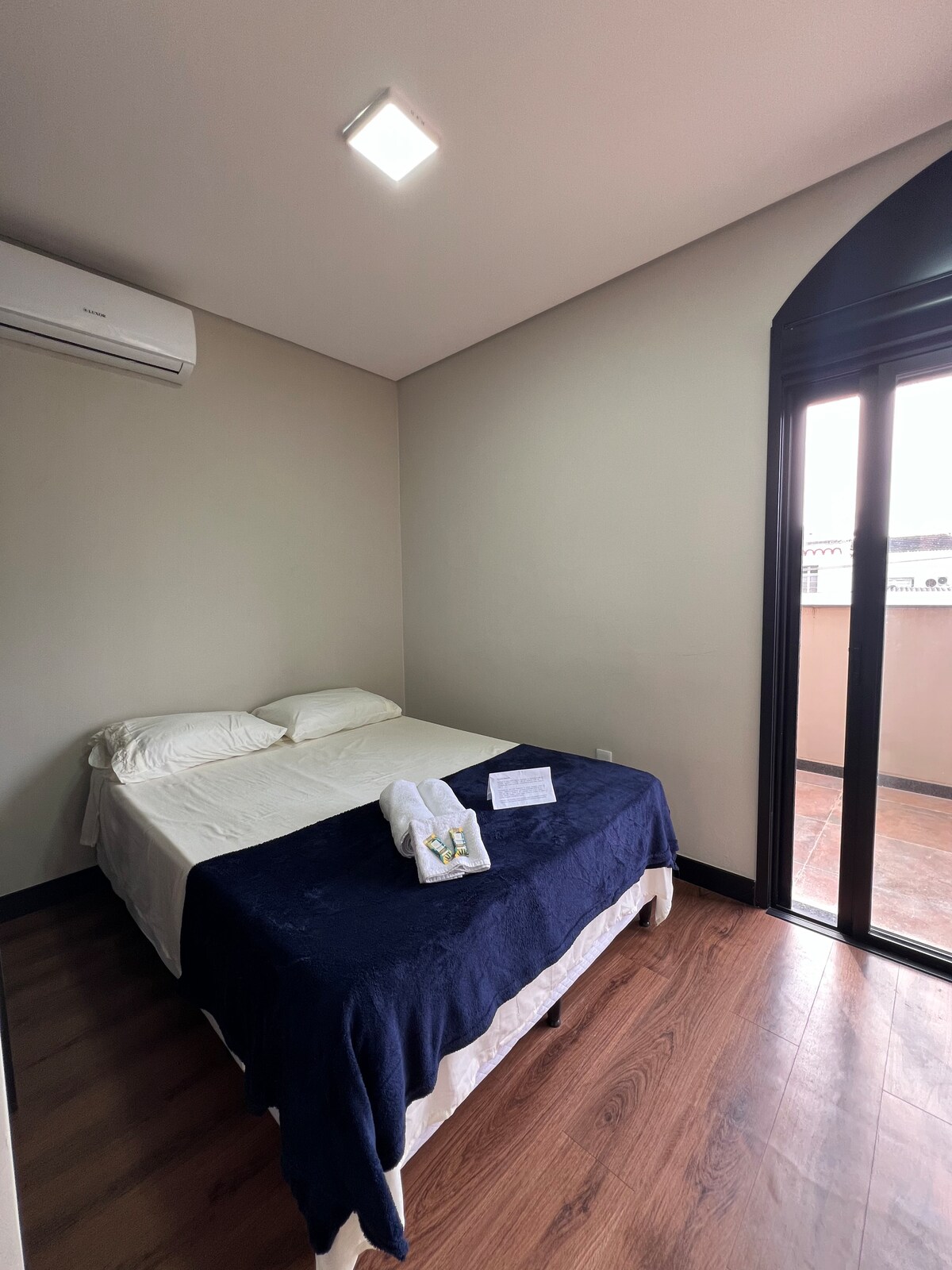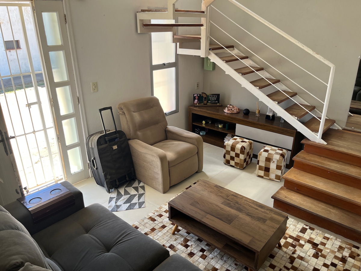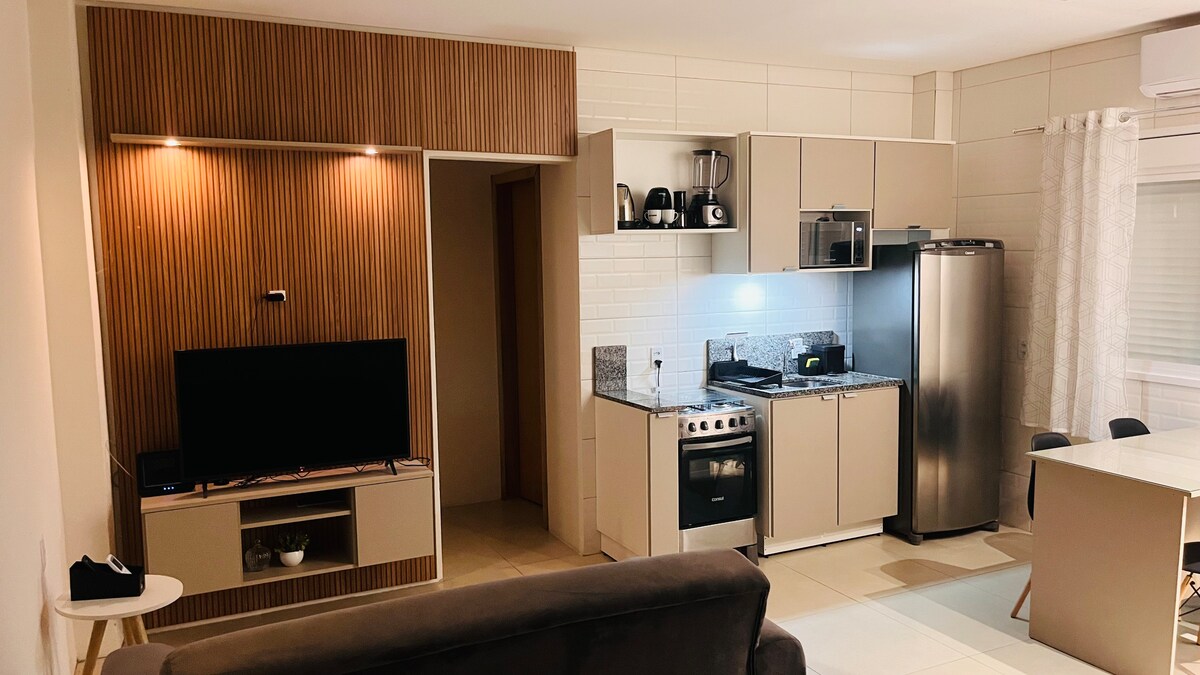 Άνετο διαμέρισμα στο κέντρο, κοντά στο Urcamp. Διαθέτει σαλόνι με καναπέ-κρεβάτι, τηλεόραση και τραπεζαρία, υπνοδωμάτιο με διπλό κρεβάτι και κλιματισμό, μπάνιο και εξοπλισμένη κουζίνα. Βρέθηκε θέση στάθμευσης για 1 όχημα. ➡️ Σημαντικοί κανόνες: Ο χώρος είναι αποκλειστικά για τους επισκέπτες. Δεν επιτρέπεται να διοργανώνετε πάρτι, να δέχεστε επισκέπτες ή να το χρησιμοποιείτε για επαγγελματικούς σκοπούς με τρίτους. Ιδανικό για ζευγάρια, επαγγελματίες που ταξιδεύουν ή όσους θέλουν να είναι σε καλή τοποθεσία για να απολαύσουν το Bagé με άνεση.
