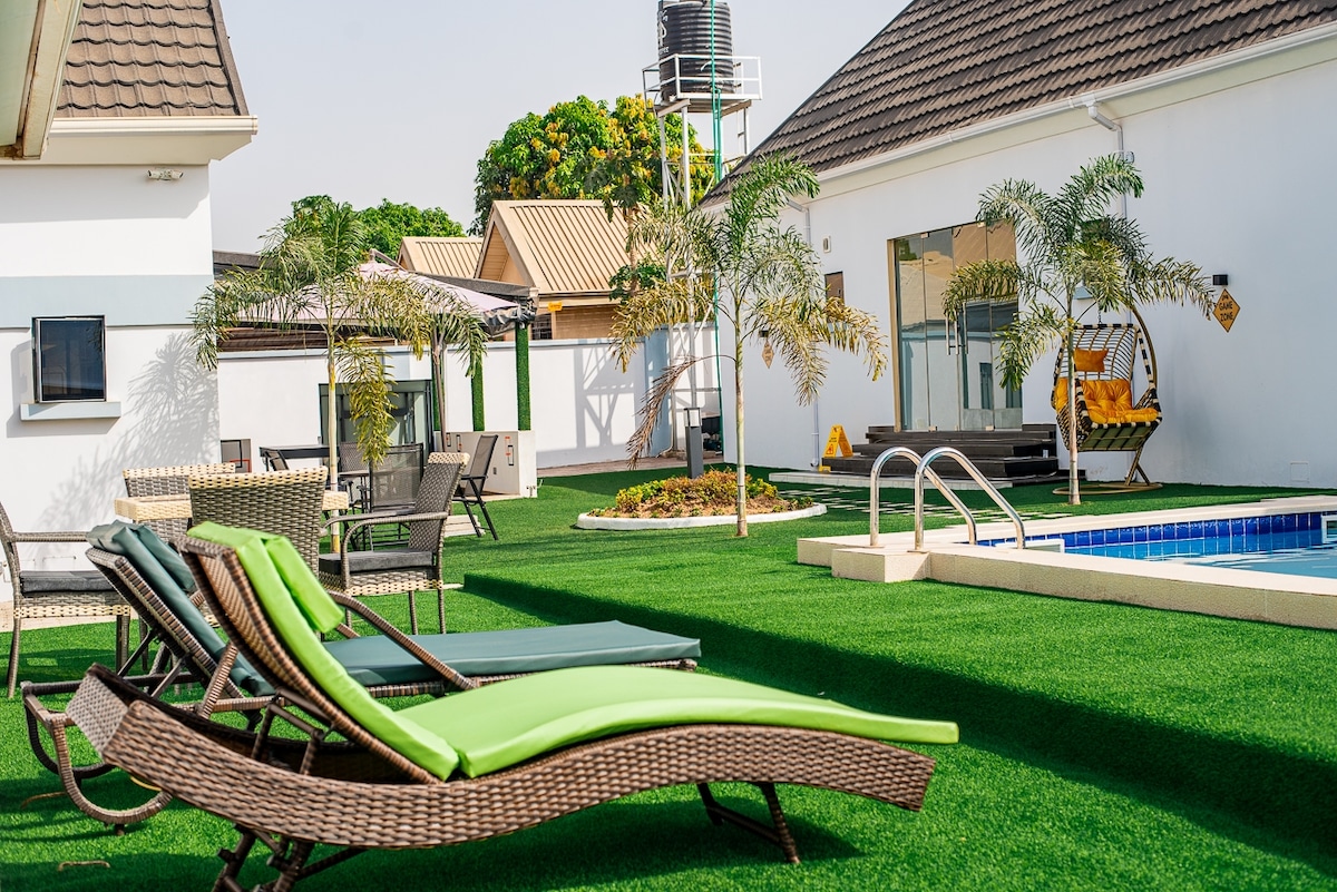 Κομψή σουίτα επισκεπτών 2 υπνοδωματίων σε ασφαλές κτήμα στο East Airport. Κάθε δωμάτιο διαθέτει έξυπνη τηλεόραση με Netflix, απεριόριστο WiFi, κλιματισμό. Απολαύστε μια πλήρως εξοπλισμένη ιδιωτική κουζίνα και μπάνιο και έναν ευάερο ανοιχτό διάδρομο ιδανικό για φαγητό. Με 24/7 πρόσβαση στην πισίνα και πλήρη ιδιωτικότητα, είναι ιδανικό για ταξιδιώτες που εκτιμούν την άνεση και την ευκολία, μόλις λίγα λεπτά από το αεροδρόμιο, τα κορυφαία εμπορικά κέντρα και τα εστιατόρια. Στην καρδιά της Άκρα, προσπαθούμε να παρέχουμε την καλύτερη δυνατή εμπειρία στον πελάτη.