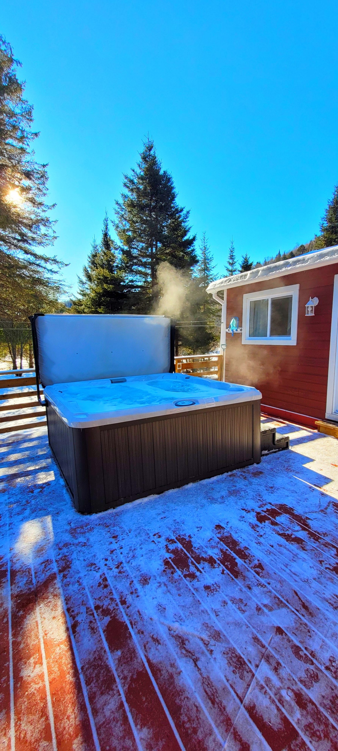 Chalet & Spa haut de gamme au cœur de la forêt accessible facilement. Avec son décor unique et chaleureux, ce chalet charme instantanément grâce à ses hauts plafonds, sa fenestration spectaculaire et son ambiance des plus conviviales. Détendez-vous dans le spa chauffé sous les flocons, près du feu intérieur ou extérieur. Profitez du plancher chauffant, du BBQ et du wifi haute vitesse. 3 chambres, 2 salles de bains, 6 lits ultra confortables. À proximité: sentiers, ski, raquettes et lacs gelés.