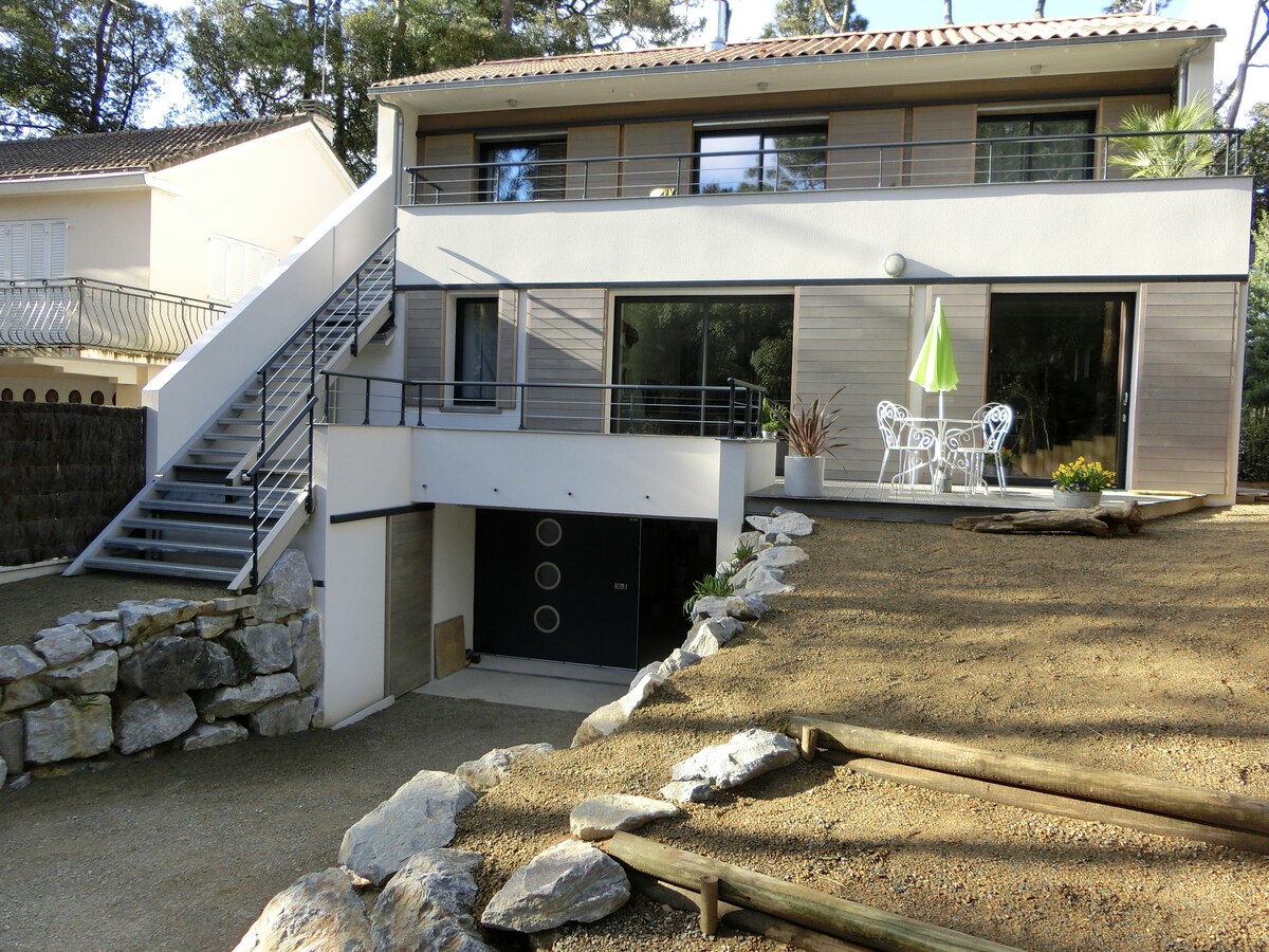 Μέρος της βίλας που βρίσκεται 300 μέτρα από την παραλία, προσφέρεισ μεγάλες γονικές σουίτες στον 1ο όροφο, με ανεξάρτητη πρόσβαση, με δύο κρεβάτια 200x160, δύο μπάνια με ντους και δύο τουαλέτες, καθώς και ένα σαλόνι με εξοπλισμένη κουζίνα και μια μεγάλη βεράντα με θέα νότια. Θα εκτιμήσετε την καλαίσθητη διακόσμηση, την ηρεμία που επικρατεί και την άμεση γειτνίαση με το παράκτιο δάσος. *** Θερινή περίοδος: ενοικίαση μόνο ανά εβδομάδα από την Παρασκευή, το Σάββατο ή την Κυριακή ***
