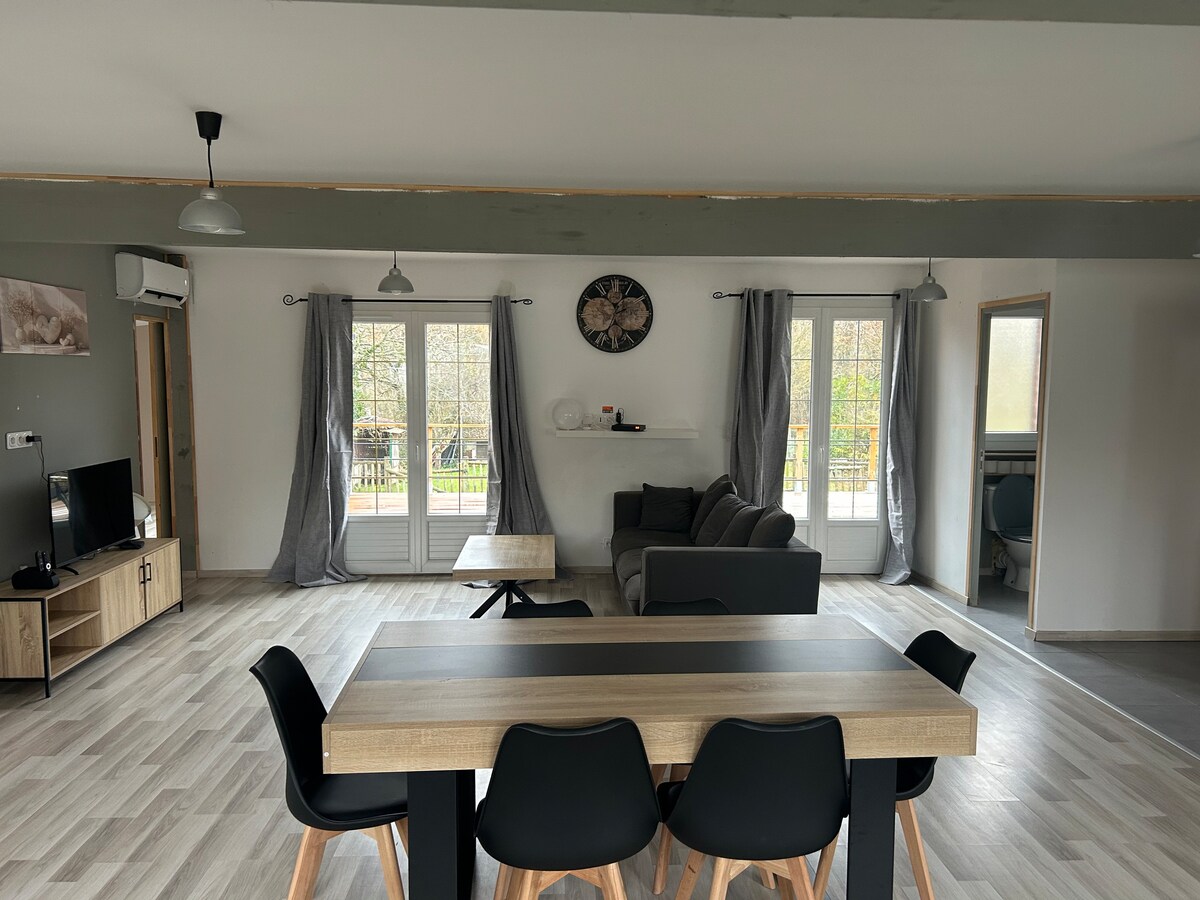 On the ground floor, a very bright 60 m² lodge, with all modern comforts, in the heart of nature and in a peaceful setting. You can make the most of the hanging bed. Large windows give you a view of the pond with its fountain in summer. Its entirely hand-crafted corded wood wall is exceptionally charming. Separate from my home, the Lodge is set in lush green surroundings.