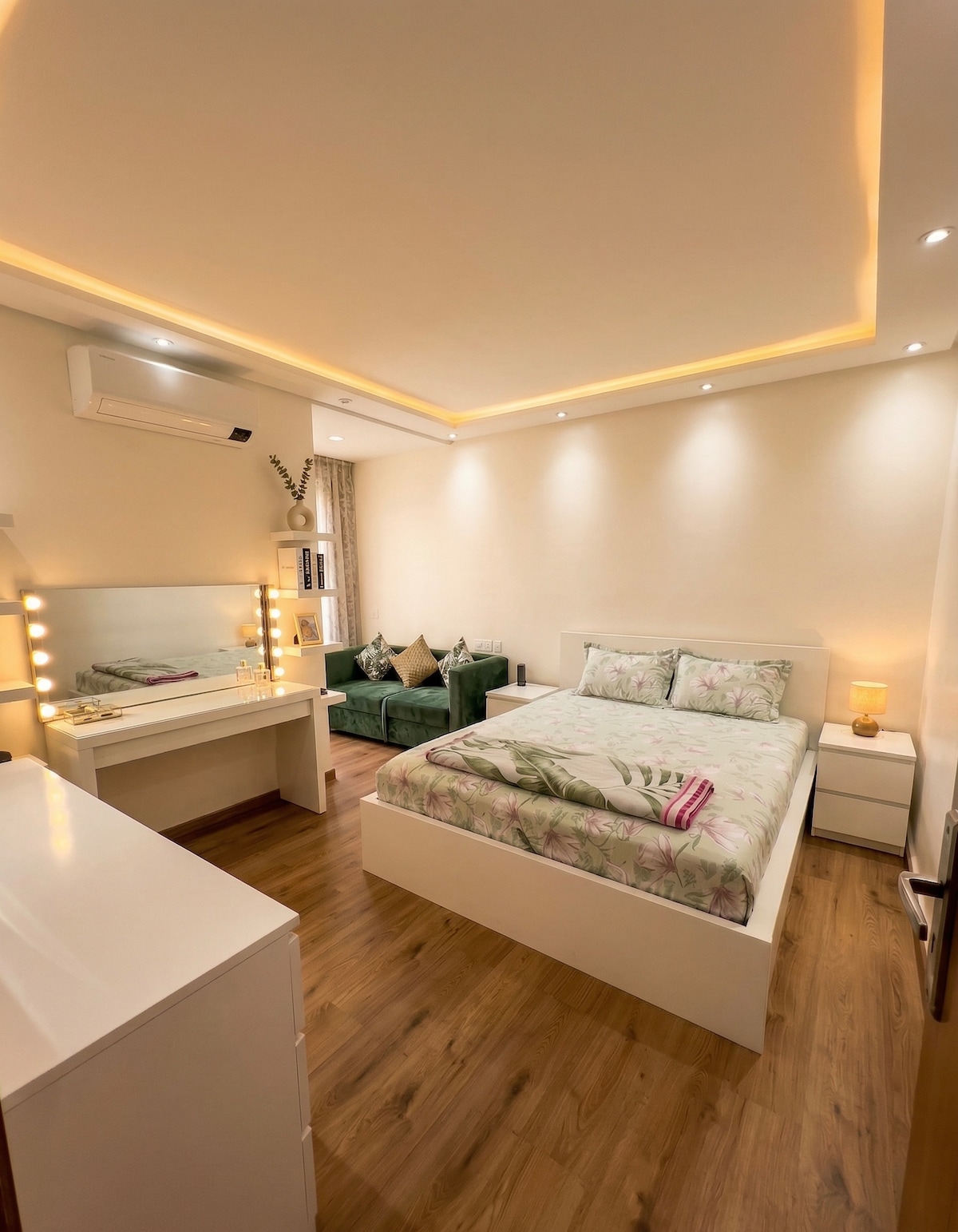 Welcome to your cosy green retreat! Enjoy a stylish comfy stay in this bright, thoughtfully designed flat - just a 15min drive from Rabat-Salé Airport &right across from Technopolis. The flat overlooks a beautiful landscaped view and sits within walking distance of all essential amenities the apartment features: A spacious open-plan living area with a large Smart TV A fully equipped kitchen A serene ensuite master bedroom with a king-size bed A cosy twin bedroom perfect for family or friends