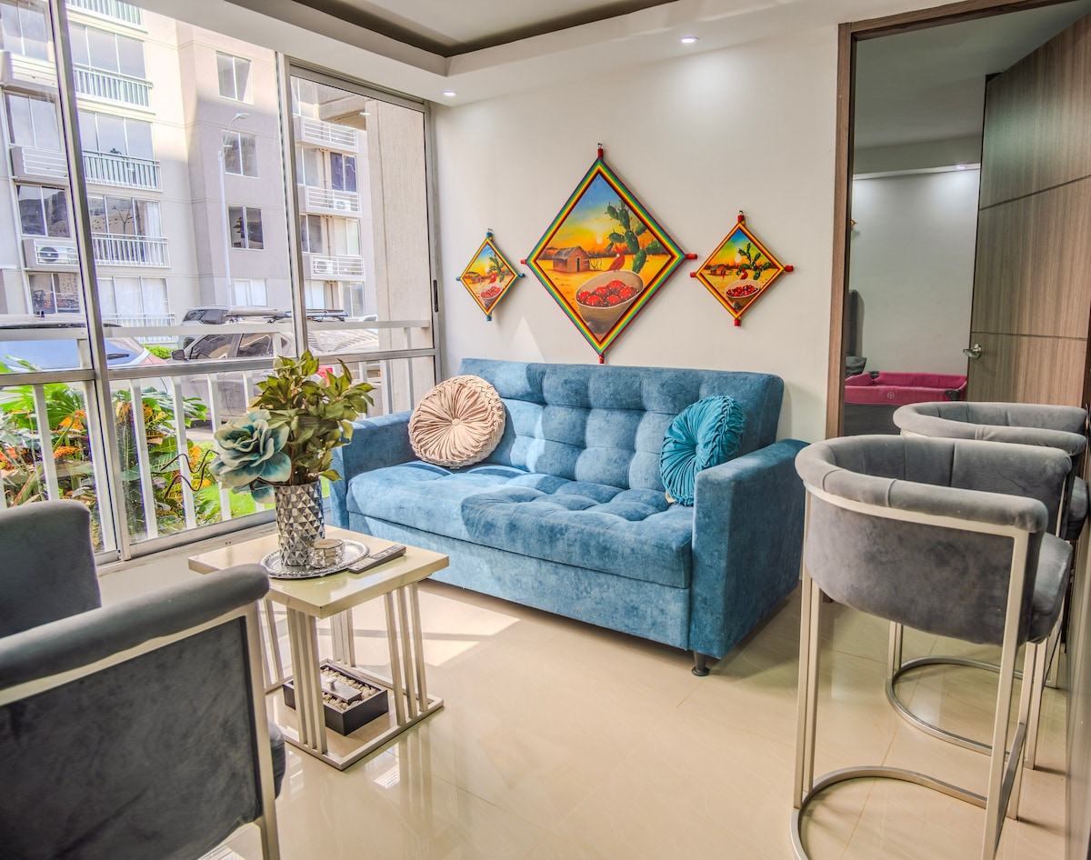 El apartamento cuenta con 2 cuartos. el principal con baño privado aire clóset y TV Wifi. el segundo cuarto aire clóset. la sala con aire TV Wifi de Movistar Alexa. balcon con vista al rio. Relájate en este espacio tranquilo y elegante. cuenta con gimnasio piscinas cancha de fútbol . 1 parqueo. Servicio de vigilancia 24 horas. Cerca de Restaurante farmacias supermercados Olímpica, Carulla, y Ara, D'uno Megatiendas y Restaurante Víctor Casual.