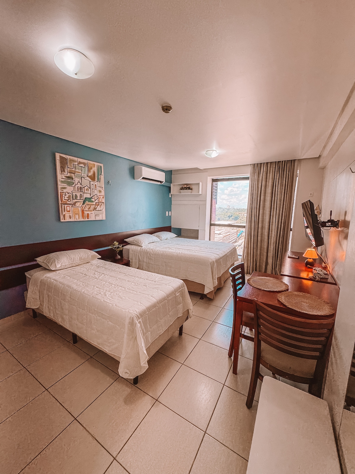 Suíte novinha, com uma linda e moderna decoracao , em hotel 4 estrelas com localizacao privilegiadíssima, em frente ao Salvador Shopping. Está situado no Caminho das Árvores, um dos bairros mais nobres de Salvador, a 100m da estacao do metro. Dispõe de smart Tv, ar condicionado, frigobar, guarda-roupa, cofre, mesa e cadeira para refeição e/ou escritório, além do banheiro que garante um banho super relaxante. Dispõe também estacionamento gratuito, piscina, academia, restaurante e salao de jogos.