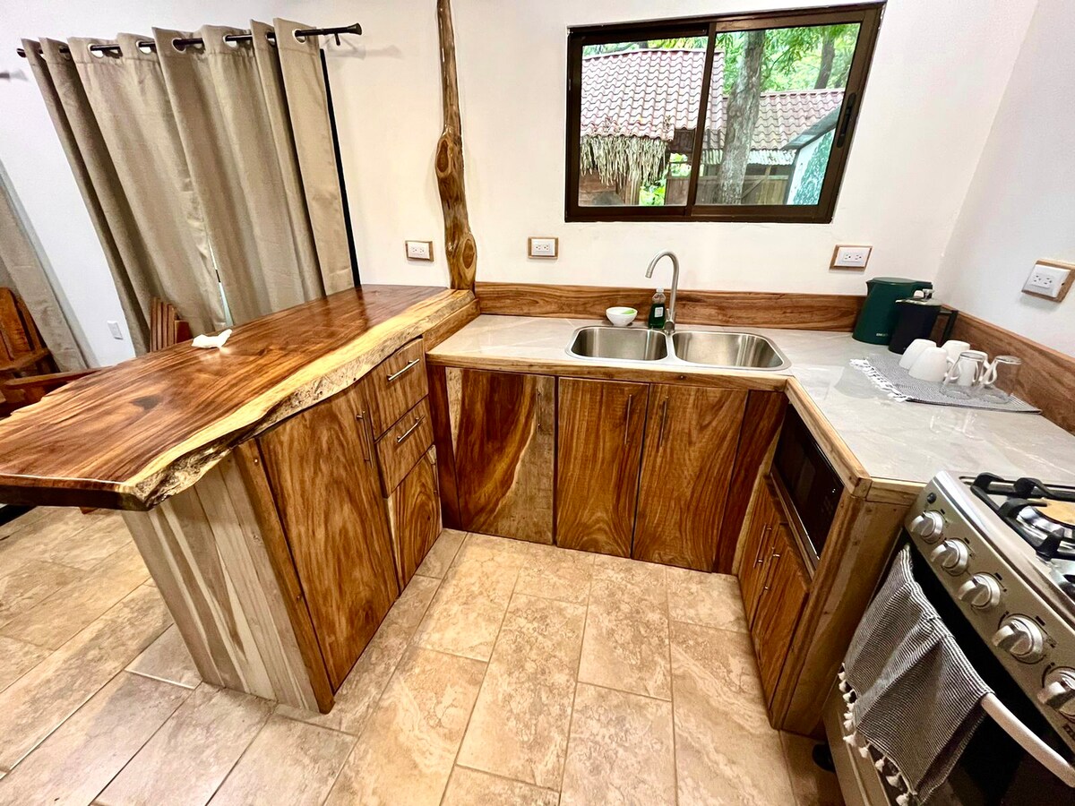 Sharing the tree-filled yard with monkeys, birds & iguanas, this light, airy, teakwood home is just 50 meters from the beach, close to the heart of Sámara. Great nature views & ocean sounds. This airy house has an open-plan kitchen - living room with many artistic, original details in local recycled woods; terrace, outdoor dining, hammock & garden. You can walk anywhere in minutes & go barefoot to the beach! NOTE: We do NOT (yet!) have AC (planned for mid-2026), but plenty of fans for air flow!