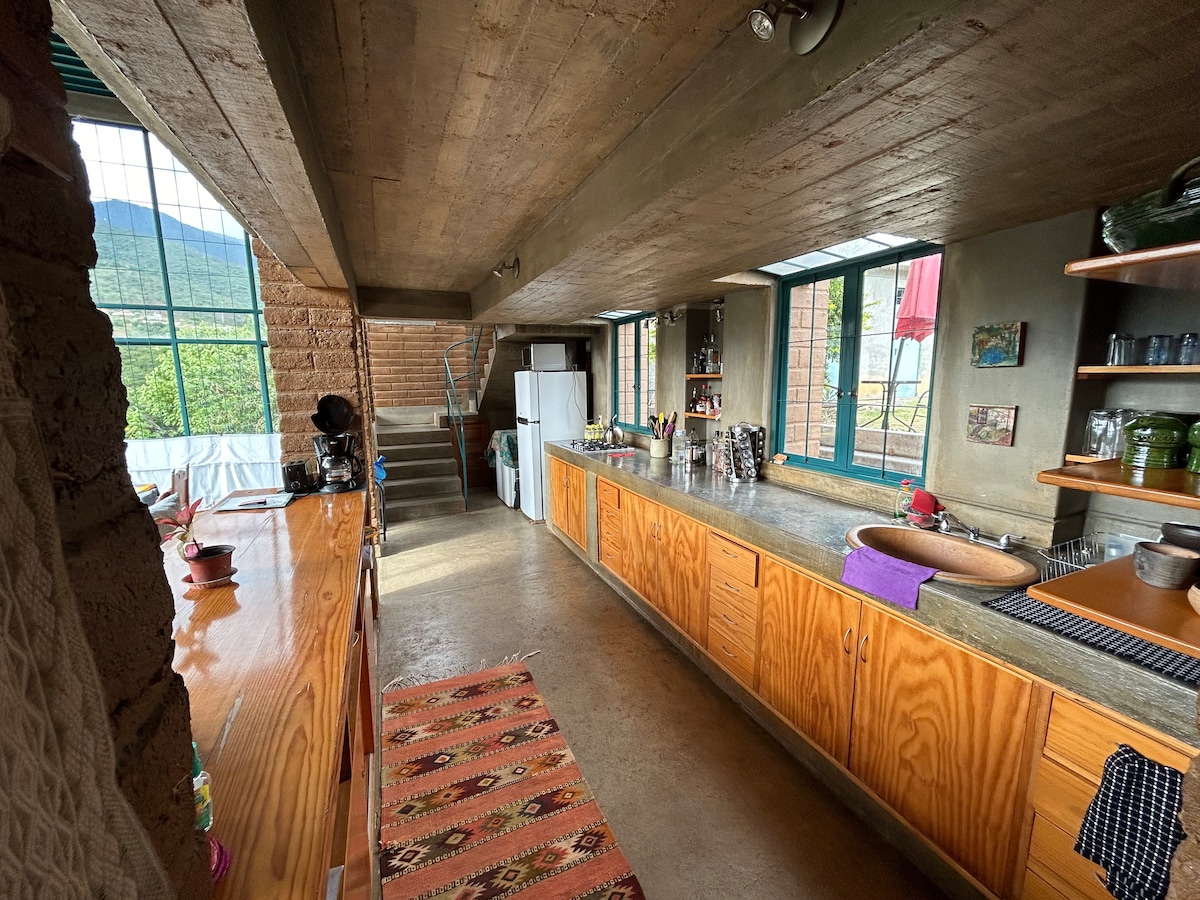 Διώροφο μπανγκαλόου που περιβάλλεται από έναν ήσυχο κήπο με θέα στο βουνό. Ο κάτω όροφος διαθέτει εξοπλισμένη κουζίνα, τραπεζαρία, καναπέ-κρεβάτι και ένα πλήρες μπάνιο. Στον επάνω όροφο υπάρχει ένα ευρύχωρο κάλυμμα τοίχου με διπλό κρεβάτι και χώρο εργασίας. Η διαμονή είναι δροσερή και καλά φωτισμένη. Έξω υπάρχουν δύο σκιερές βεράντες και μια μικρή πισίνα εξοπλισμένη για σταθερό κολύμπι. Βρίσκεται 20 λεπτά από το κέντρο της Οαχάκα.