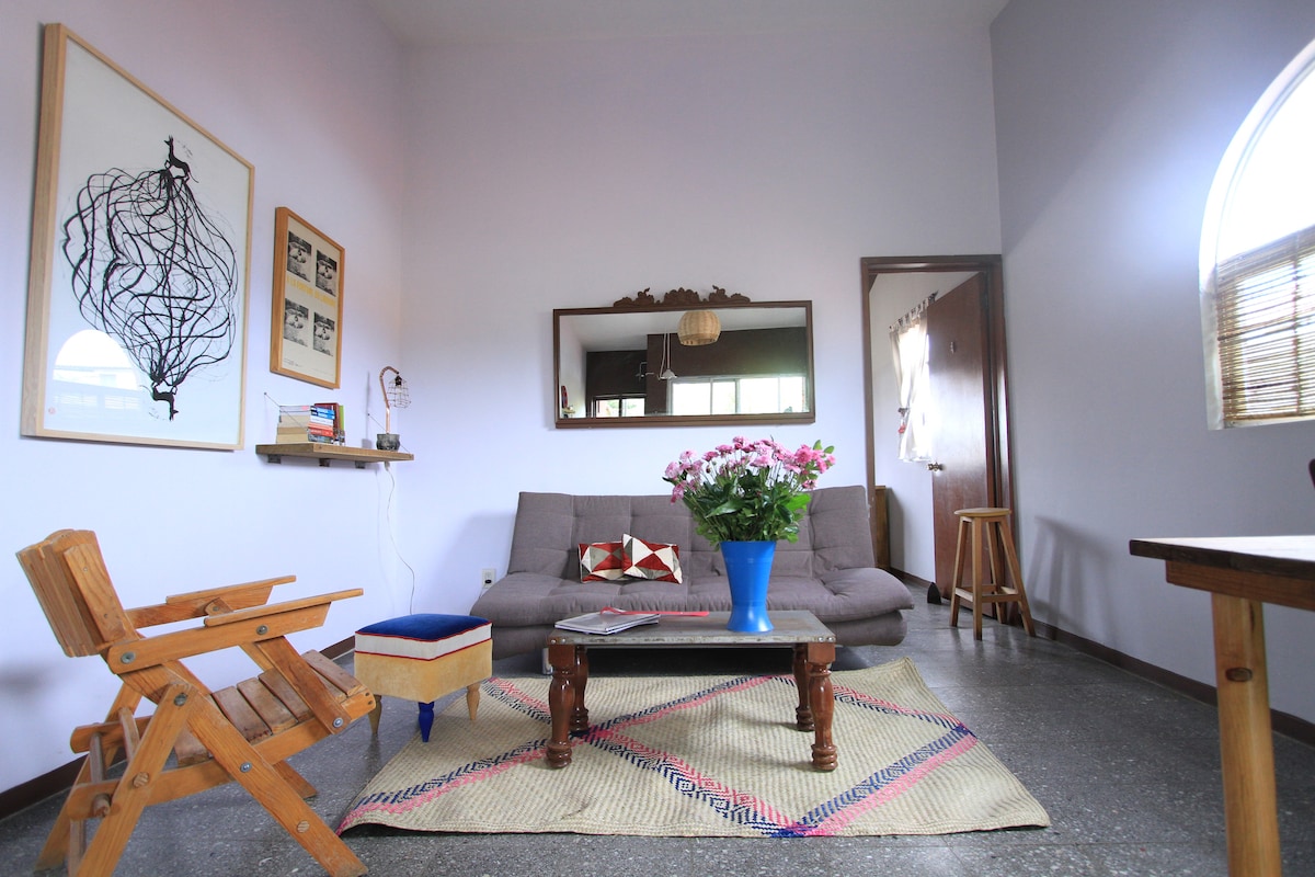 Μεγάλη σοφίτα με εξοπλισμένη κουζίνα και ιδιωτικό κήπο (ιδανικό για κατοικίδια). Ανακαινισμένο με αυθεντικά έπιπλα μέσα σε ένα παλιό εργοστάσιο ασβέστη. 10 λεπτά (2 χλμ.) με τα μέσα μαζικής μεταφοράς ή με το αυτοκίνητο από το Zócalo. 20 λεπτά με τα πόδια από την τουριστική περιοχή. 49 τ.μ. εσωτερικό + 22 τ.μ. εξωτερικό.