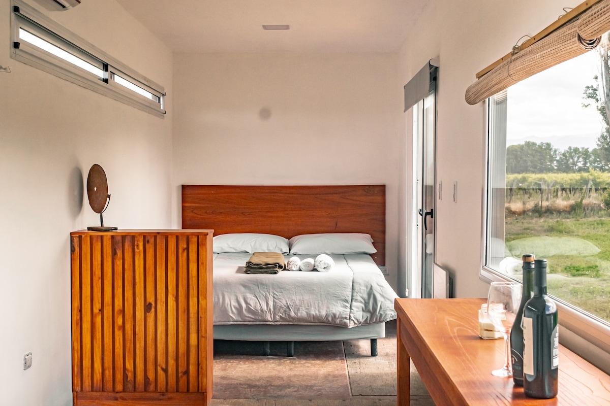 Loft elevado Un espacio acogedor y funcional, rodeado de la serenidad de los viñedos al pie de la Cordillera de los Andes. Almuerzos de campo disponibles con degustación de vinos propios y de la zona. Equipamiento básico: Cama cómoda. Baño completo. Aire acondicionado frío/calor Heladera bajo mesada, microondas, pava eléctrica Incluye desayuno de cortesía. Ideal para pernoctar y desconectar, despertar con vistas únicas y disfrutar de lo esencial en plena naturaleza. Horno de barro, parrilla.
