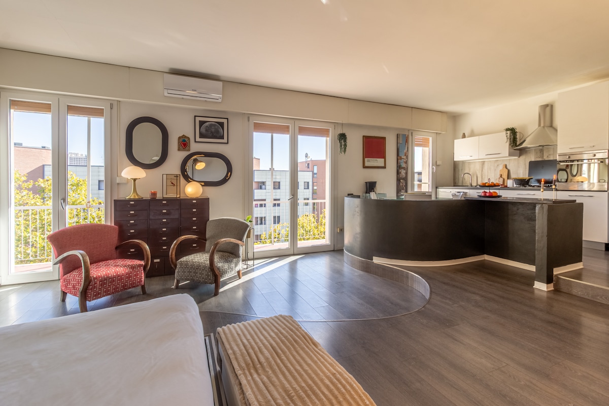 Κομψό, πλήρως ανακαινισμένο διαμέρισμα πάνω από τα διάσημα στοές της Μπολόνια, πρόσφατα ανακηρυχθεί Παγκόσμια Κληρονομιά από την UNESCO. Ο χώρος περιλαμβάνει ένα μεγάλο μπάνιο και έναν ανοιχτό χώρο με πλήρως εξοπλισμένη κουζίνα και ένα σαλόνι με ένα άνετο κρεβάτι για δύο άτομα. Κατά τη διάρκεια της αποκατάστασης, ανακαλύφθηκαν τοιχογραφίες που χρονολογούνται στον 19ο αιώνα και τώρα ενισχύονται από ένα εξελιγμένο σύστημα φωτισμού. Η εκλεπτυσμένη διακόσμηση θυμίζει την πολυτέλεια Rococo και την avant-garde της δεκαετίας του 1970.