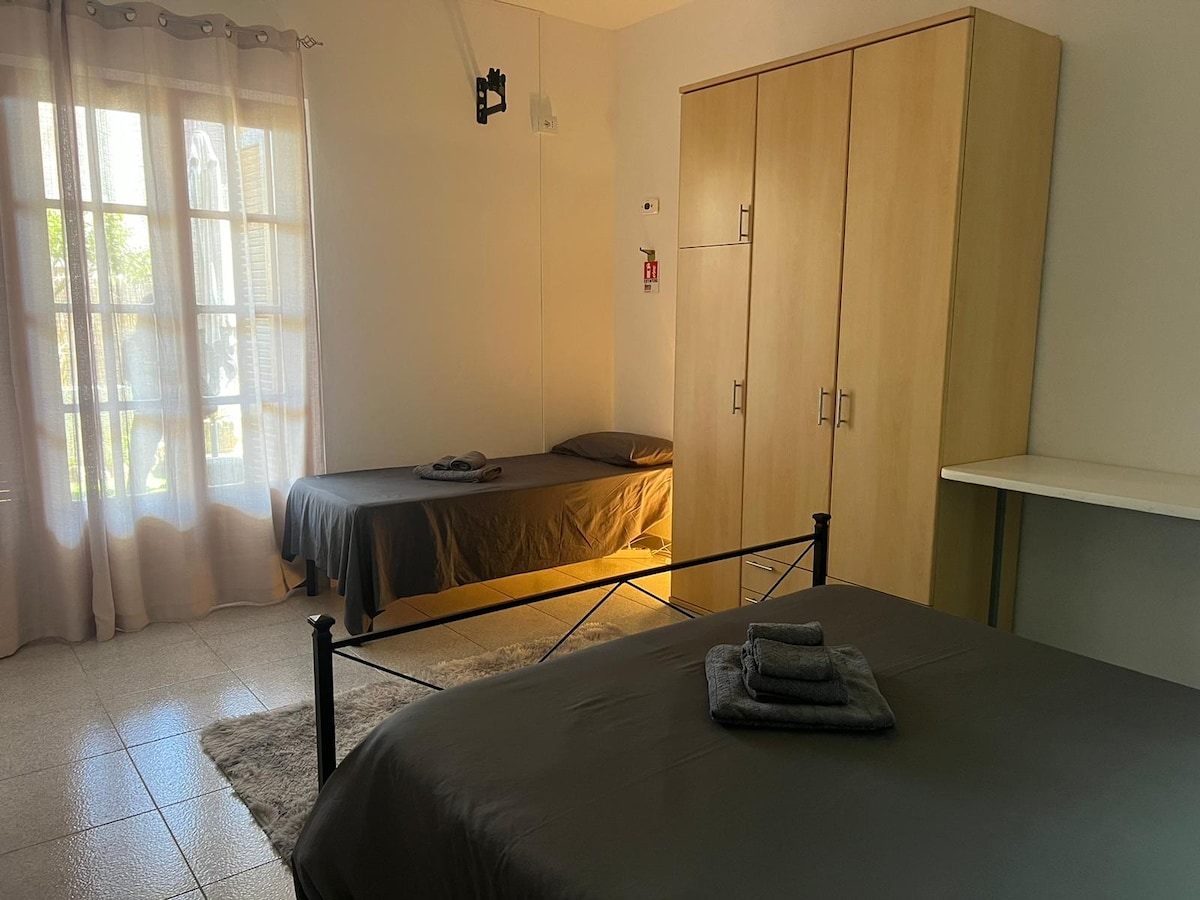 Ένα άνετο και λειτουργικό διαμέρισμα, το οποίο περιλαμβάνει υπνοδωμάτιο με υπέρδιπλο κρεβάτι και μονό κρεβάτι, γραφείο και ντουλάπα. Ιδιωτικό μπάνιο με πλυντήριο ρούχων και όλα όσα χρειάζεστε. Η κουζίνα βρίσκεται σε εξωτερικό χώρο, κάτω από την εξωτερική βεράντα. Είναι εξοπλισμένη με δύο επαγωγικές εστίες, πιάτα, ψυγείο, χώρο χαλάρωσης και τραπέζι φαγητού. Επιπλέον, η ιδιοκτησία διαθέτει κλιματισμό και ανεμιστήρες. Τηλεόραση και Wi-Fi. Μπορείτε να παρκάρετε στο στενό δρομάκι μπροστά από το σπίτι· τα ποδήλατα και οι μοτοσικλέτες μπορούν επίσης να σταθμεύσουν στον κήπο.