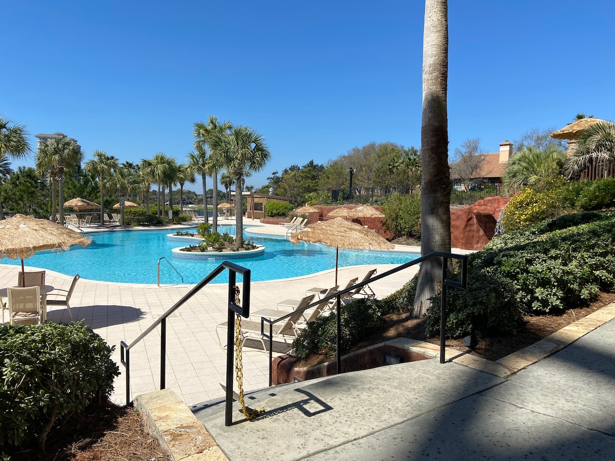 Υπέροχο στούντιο στο θέρετρο Miramar Beach/Sandestin. Θερμαινόμενη πισίνα όλο το χρόνο, τζακούζι, 4 γήπεδα γκολφ, γήπεδα τένις, pickleball, εγκαταστάσεις γυμναστικής και εστιατόρια Baytowne σε μικρή απόσταση.Πάσο λεωφορείου. Καφετιέρες Drip και Keurig. Έχουμε ένα κλουβί που περιέχει ένα ψυγείο, ομπρέλα, καρέκλες θαλάσσης, σανίδες boogie και ένα καρότσι θαλάσσης για να το κουβαλάμε στην παραλία.Ταράτσα με πανοραμική θέα και φωτογραφίες της Σμαραγδένιας Ακτής. King size κρεβάτι και επιπλέον πτυσσόμενος καναπές-κρεβάτι.