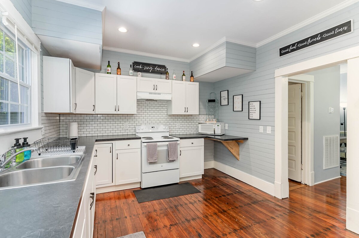 This 1930s cottage is the perfect spot for your stay in downtown Southern Pines. It is located on a quiet street, yet close enough to walk to all the shops/restaurants downtown or the Weymouth Center for the Humanities. This loft unit has a private entrance from the top of the stairs with 1 bedroom (Queen) & 1 bath, a full kitchen, and shared laundry room downstairs in the back of the home. Unit features vintage kitchen! Come stay with us for a short stay or extended stay!