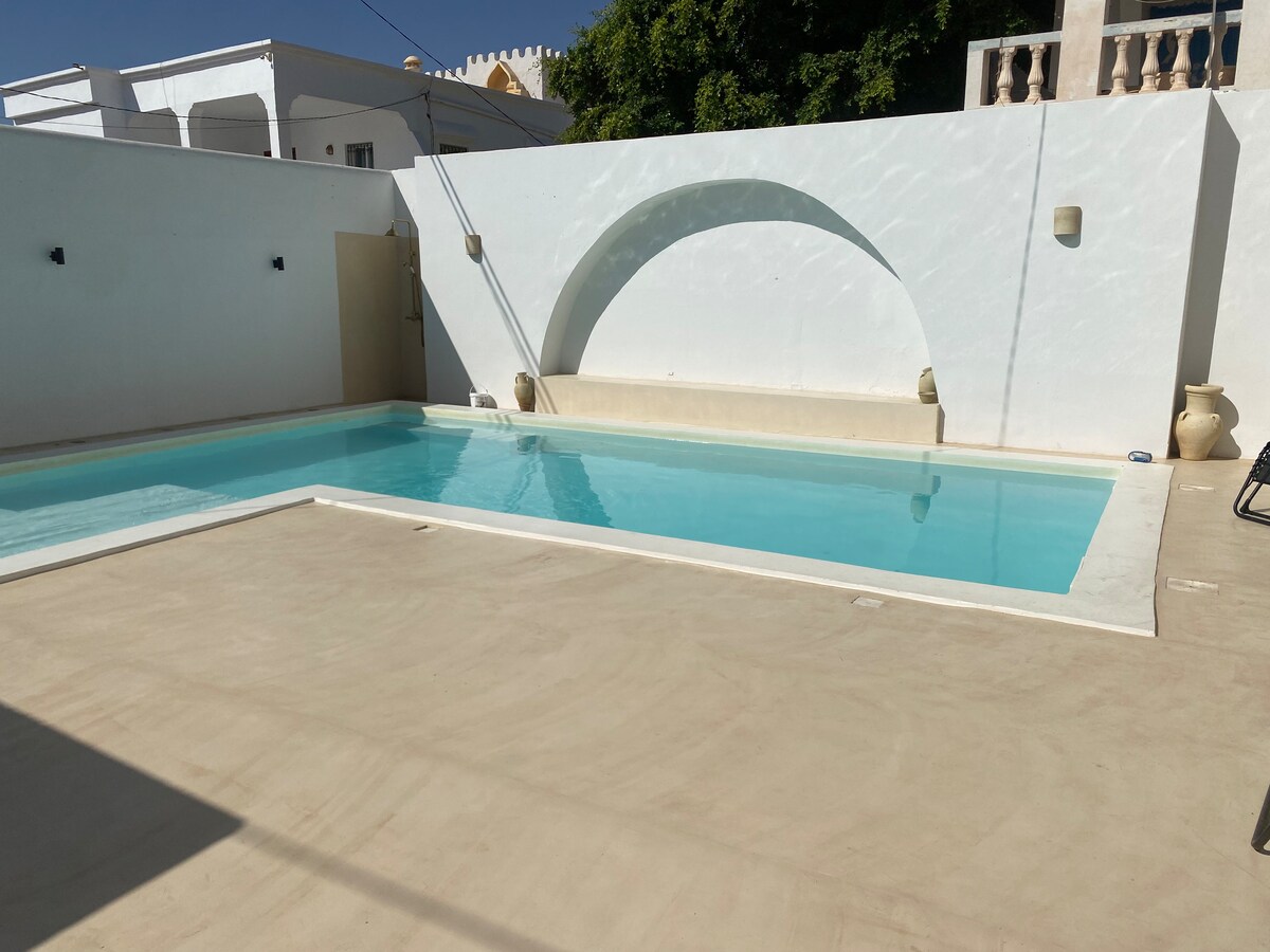 Χαλαρώστε σε αυτόν τον ήρεμο, κομψό χώρο. Με djerbian αρχιτεκτονική που βρίσκεται στην καρδιά της τουριστικής περιοχής Προσφέρουμε στους επισκέπτες μας έναν ήσυχο χώρο για διακοπές , 3 λεπτά από την παραλία, ωραία πισίνα με χώρο μπάρμπεκιου. Προσφέρουμε στους επισκέπτες μας όλες τις καλές τοποθεσίες για ψώνια, εστιατόρια ,μουσεία ,δραστηριότητες ,ιππασία και τετράτροχες περιηγήσεις και εκδρομές με αυτοκίνητα 4x4 24/24 υπηρεσία προσωπικής εξυπηρέτησης κοντά στη βίλα Δεξαμενή νερού έκτακτης ανάγκης πάντα διαθέσιμη 😉