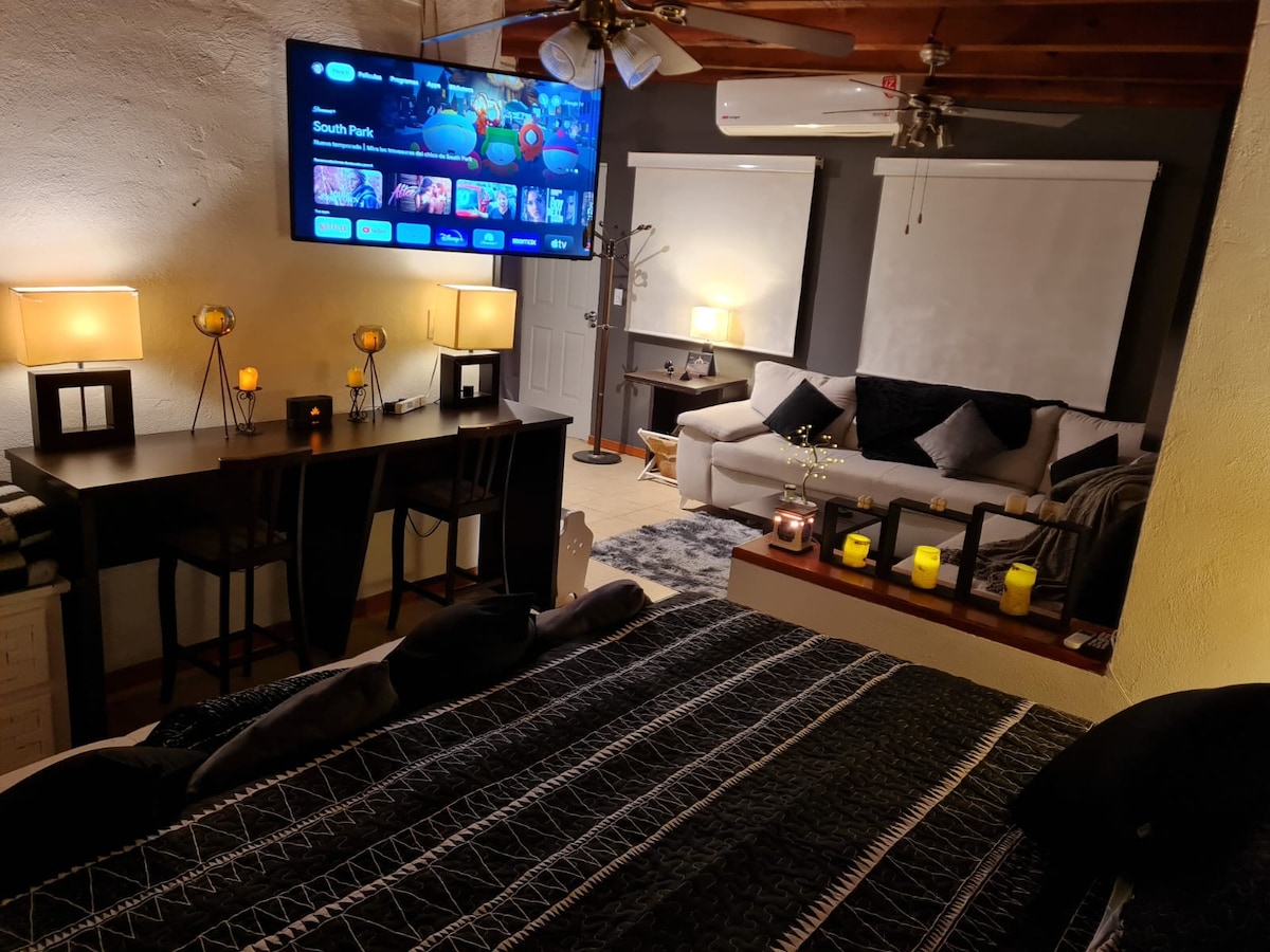 TINACO Y BOMBA. Excelente mobiliario. Funcional Cocina y refrigerador. Sillón de lectura, mesa y sillas. Cama matrimonial. Ventana con reja y cortina. Baño completo con regadera. Boiler externo. AC frío/calor. TV 32 in. Wi fi ALTA VELOCIDAD fibra óptica. Patio externo. Restaurants, bancos, clínicas, cercanos. Sofá cama para tercer huésped (costo extra). Rampa para aparcar. NO HAY ESCALONES. Barrio residencial tranquilo. Cámaras externas de seguridad.