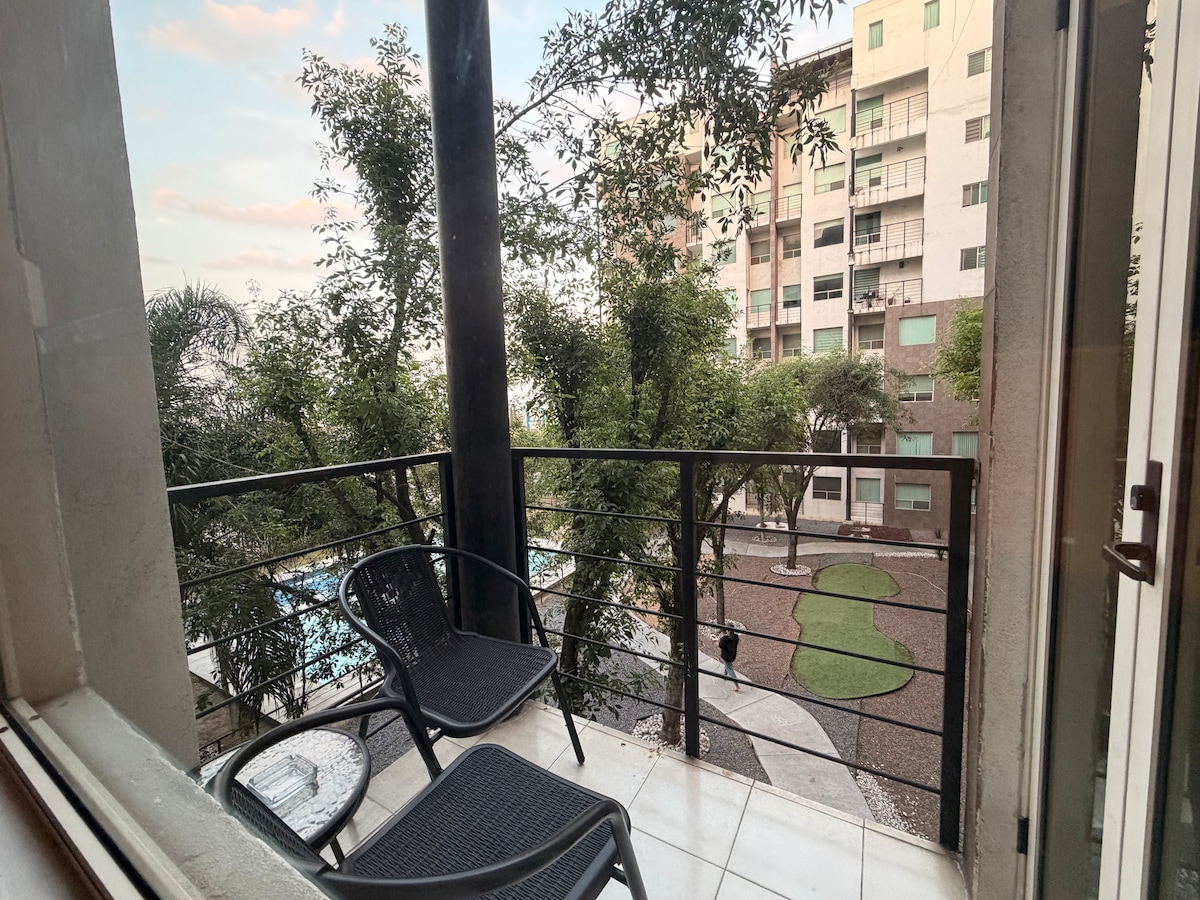 Amplio y recién remodelado departamento en una zona muy tranquila de Santa Catarina, con amplios jardines, alberca y gimnasio. En condominio con entrada privada, en planta baja, sin escalones. Cuenta con amplios baño y closet, y terraza que da hacia jardines. La recámara tiene cama king size y TV de 42''. La sala tiene sofácama y televisión de 65''. Hay lavasecadora, microondas, cafetera, horno, refrigerador y utensilios de cocina. A 10 minutos del Parque La Huasteca y del Consulado Americano.