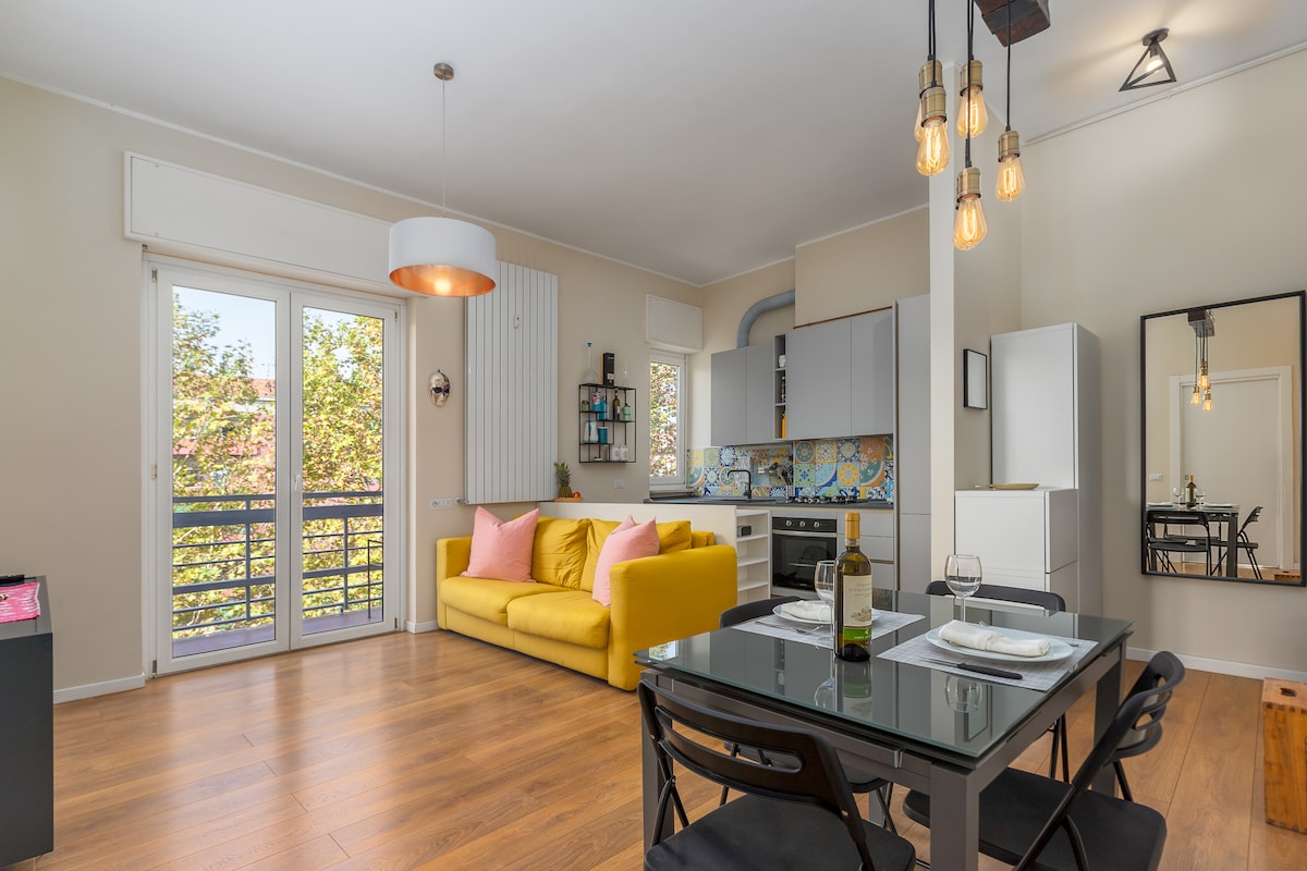 Bright silent apartment 3rd floor whit elevator 50 meters from yellow subway only 6 stops to the city center Duomo Cathedral (10 mins) 10 stops to the central station 2 stops to the Rogoredo train station bus night service 0:28-5:45am at 20 mt Supermarket at 10 mt - Carrefour at 200 mt H24 big Tv free fast wi-fi Netflix Big shower washer & dryer Space for 4 adults big bed 200x160 and sofa bed 200x140 whit large size mattress Big balcony with table, chairs and space for relaxing ☺️