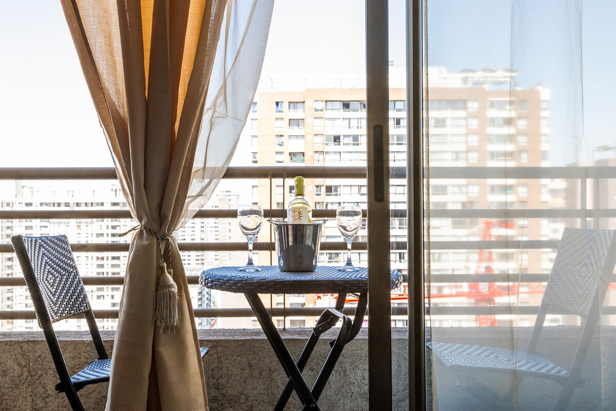 Ξυπνήστε κάθε πρωί με μια εκπληκτική πανοραμική θέα στα βουνά των Άνδεων από τον 15ο όροφο αυτού του άνετου και μοντέρνου στούντιο. Νέος, προσεκτικά διακοσμημένος και εξοπλισμένος για να νιώσετε σαν στο σπίτι σας. Ιδανικό για ζευγάρια και ταξιδιώτες, με στρατηγική και ασφαλή τοποθεσία μπροστά από τον σταθμό του μετρό Irarrázaval στις γραμμές 3 και 5, με άμεση πρόσβαση σε ολόκληρη την πόλη του Σαντιάγο. ⚡ 600MB συμμετρικό ίντερνετ οπτικών ινών: γρήγορη και σταθερή σύνδεση.